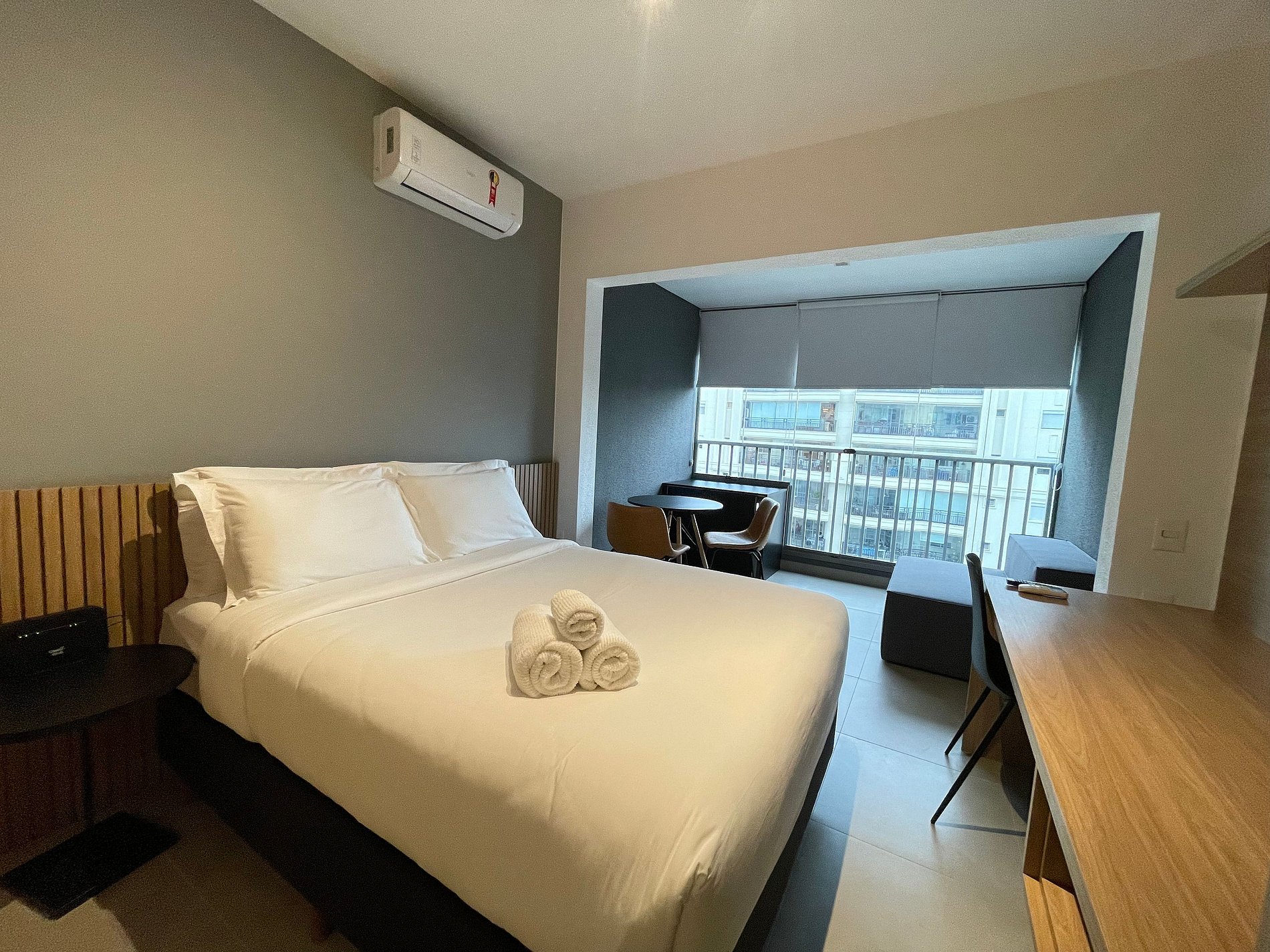 The studio features a queen-size bed with premium hotel-quality linens, air conditioning, Wi-Fi, and a fully equipped compact kitchen with a refrigerator, microwave, coffee maker, electric kettle, and sandwich maker. The spacious balcony, with a dining table and sofa, is a standout feature that extends the living area—ideal for relaxing or enjoying meals with a city view.
