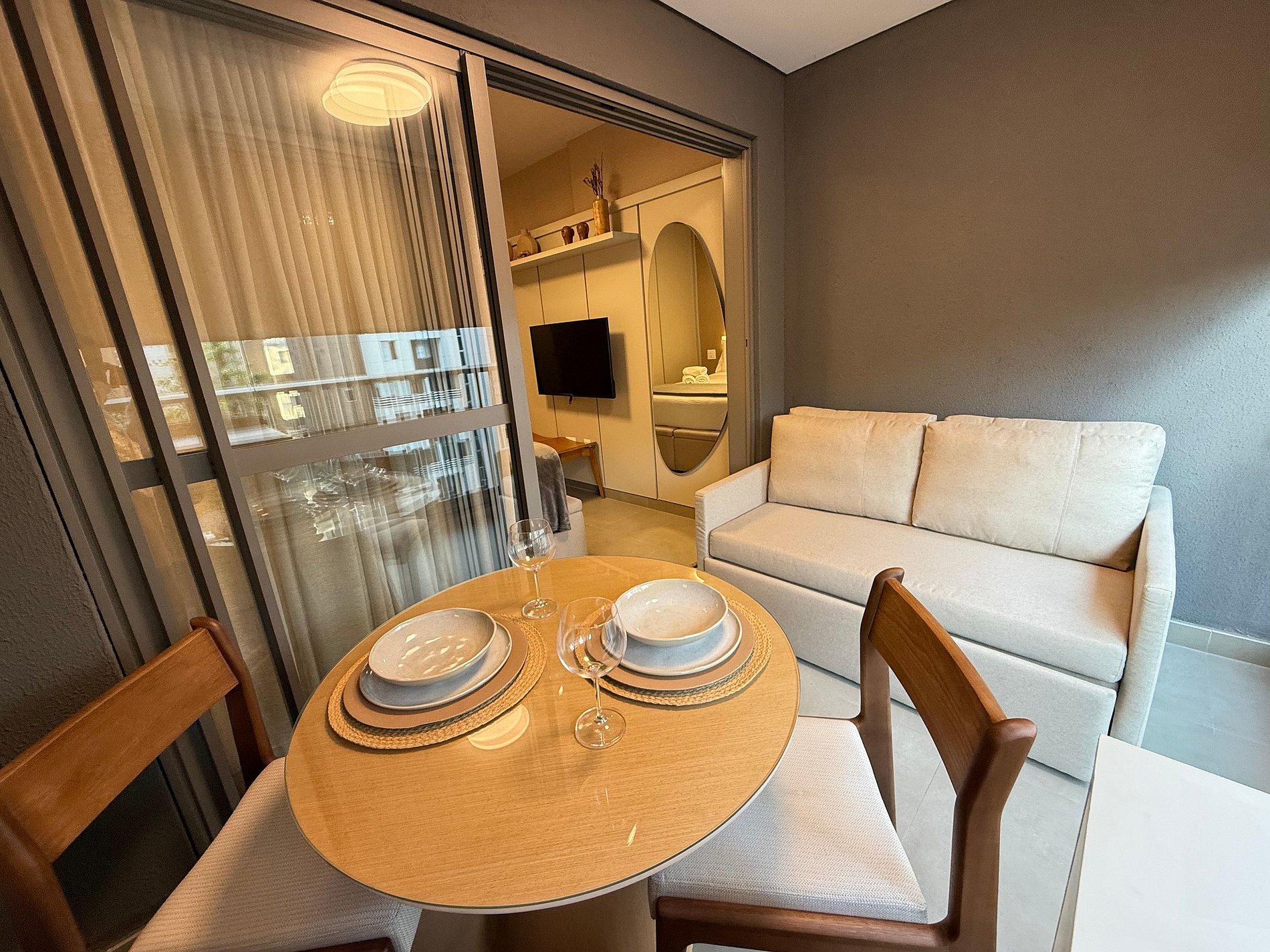 The studio features a queen-size bed with premium hotel-quality linens, air conditioning, Wi-Fi, and a fully equipped compact kitchen with a refrigerator, microwave, coffee maker, electric kettle, and sandwich maker. The spacious balcony, with a dining table and sofa, is a standout feature that extends the living area—ideal for relaxing or enjoying meals with a city view.
