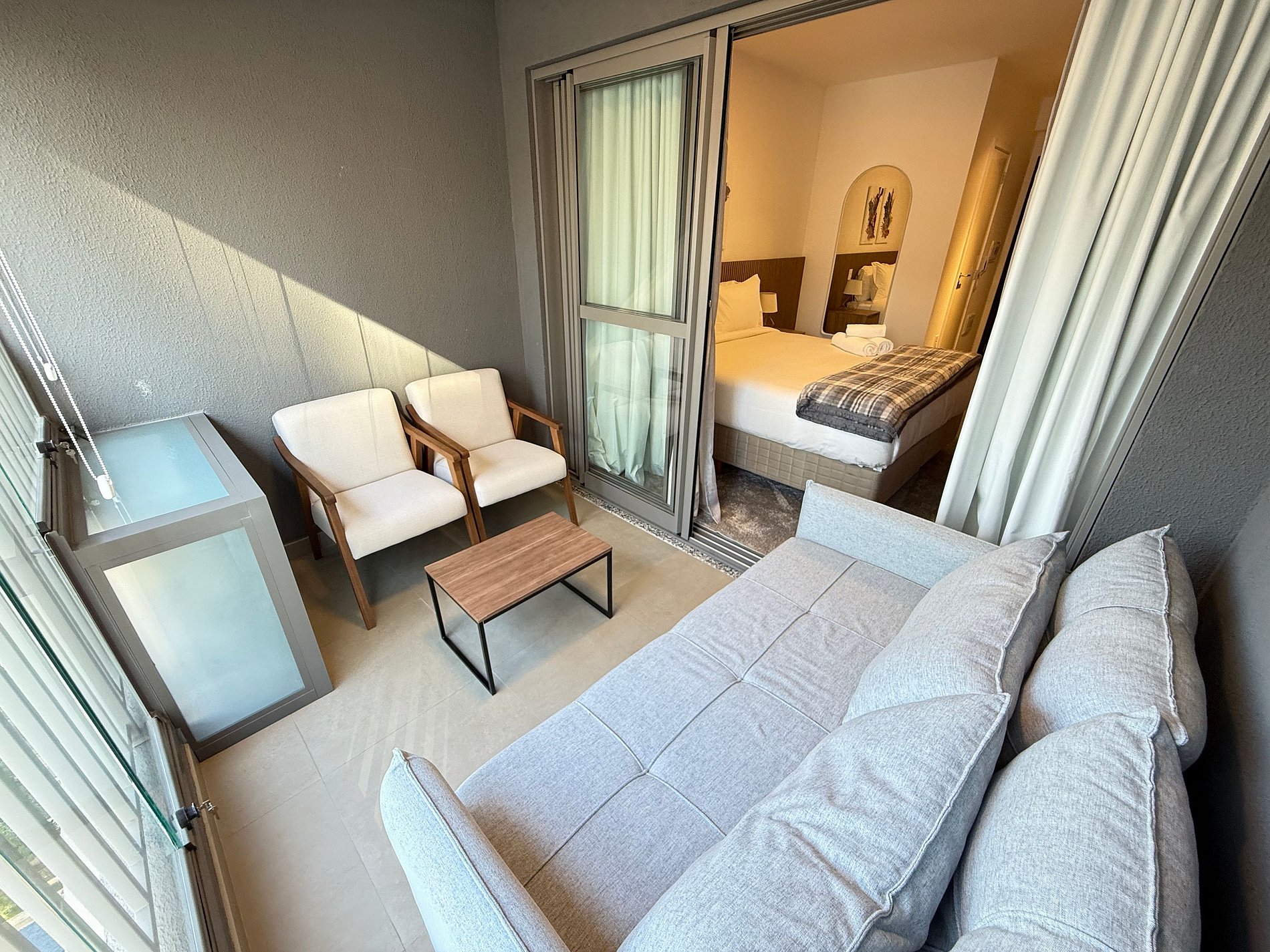 The studio features a queen-size bed with premium hotel-quality linens, air conditioning, Wi-Fi, and a fully equipped compact kitchen with a refrigerator, microwave, coffee maker, electric kettle, and sandwich maker. The spacious balcony, with a dining table and sofa, is a standout feature that extends the living area—ideal for relaxing or enjoying meals with a city view.