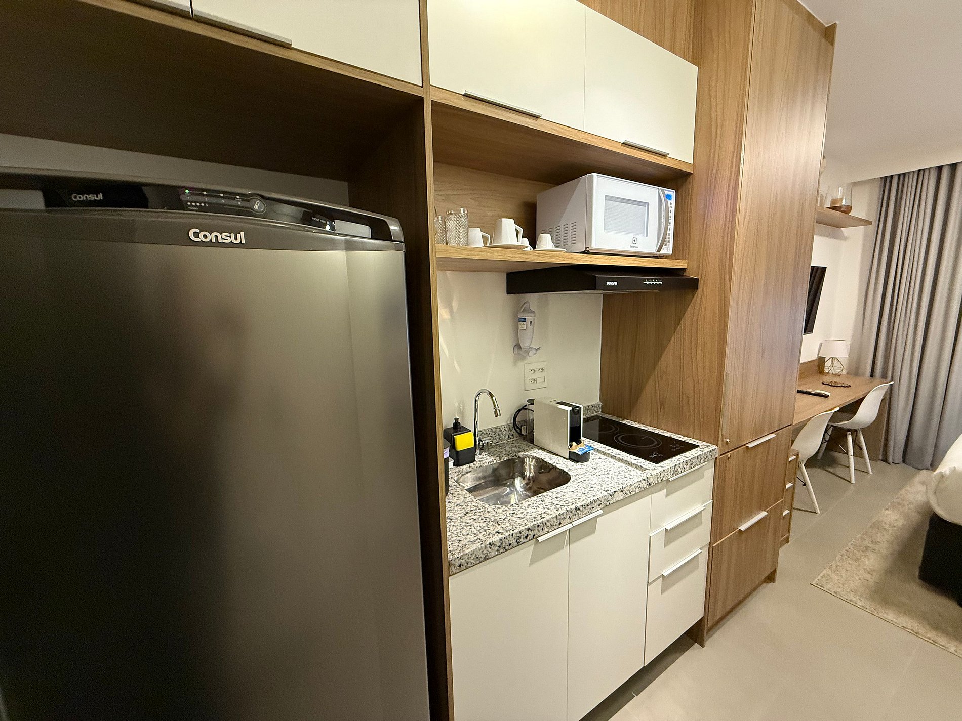 Os hóspedes encontrarão uma cama queen com enxoval de hotelaria premium, ar-condicionado, Wi-Fi de alta velocidade e uma cozinha compacta totalmente equipada com geladeira, micro-ondas, cafeteira, chaleira elétrica e sanduicheira. A varanda ampla, com mesa de jantar e sofá, funciona como uma extensão aconchegante do studio, perfeita para momentos de descanso ou refeições com vista para a cidade.