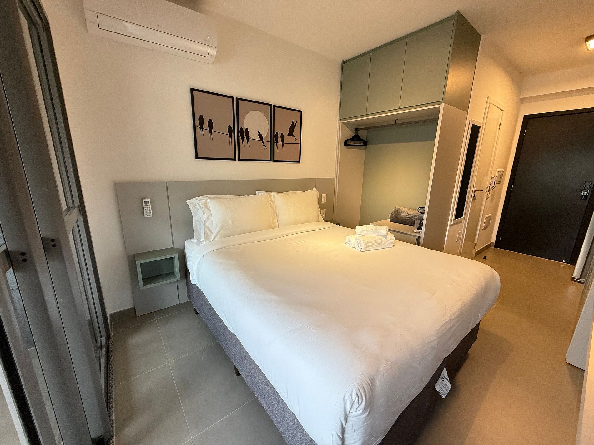 Os hóspedes encontrarão uma cama queen com enxoval de hotelaria premium, ar-condicionado, Wi-Fi de alta velocidade e uma cozinha compacta totalmente equipada com geladeira, micro-ondas, cafeteira, chaleira elétrica e sanduicheira. A varanda ampla, com mesa de jantar e sofá, funciona como uma extensão aconchegante do studio, perfeita para momentos de descanso ou refeições com vista para a cidade.