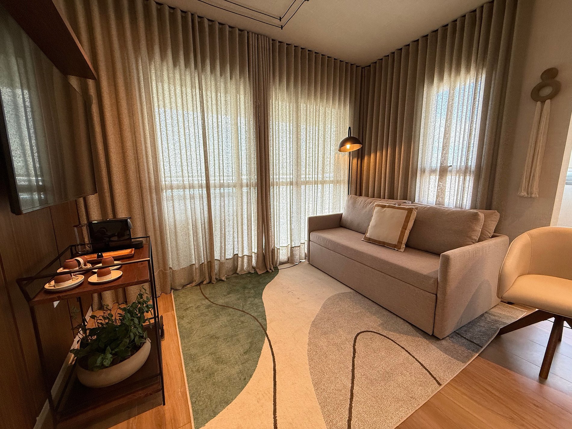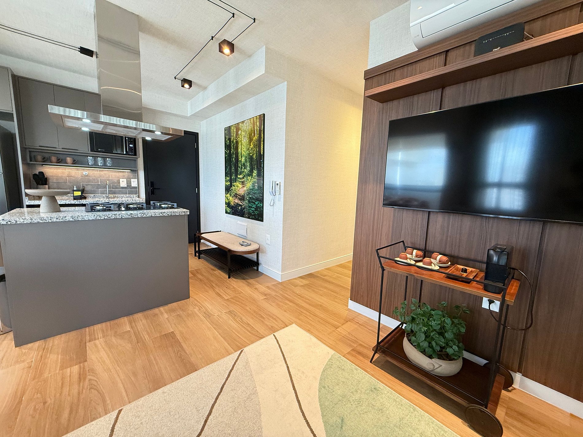 Os hóspedes encontrarão uma cama queen com enxoval de hotelaria premium, ar-condicionado, Wi-Fi de alta velocidade e uma cozinha compacta totalmente equipada com geladeira, micro-ondas, cafeteira, chaleira elétrica e sanduicheira. A varanda ampla, com mesa de jantar e sofá, funciona como uma extensão aconchegante do studio, perfeita para momentos de descanso ou refeições com vista para a cidade.