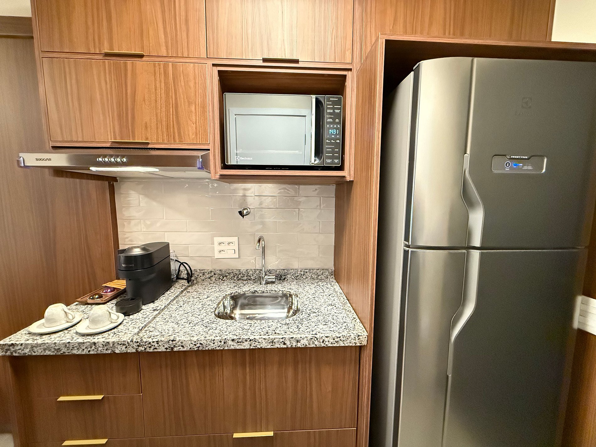 Os hóspedes encontrarão uma cama queen com enxoval de hotelaria premium, ar-condicionado, Wi-Fi de alta velocidade e uma cozinha compacta totalmente equipada com geladeira, micro-ondas, cafeteira, chaleira elétrica e sanduicheira. A varanda ampla, com mesa de jantar e sofá, funciona como uma extensão aconchegante do studio, perfeita para momentos de descanso ou refeições com vista para a cidade.