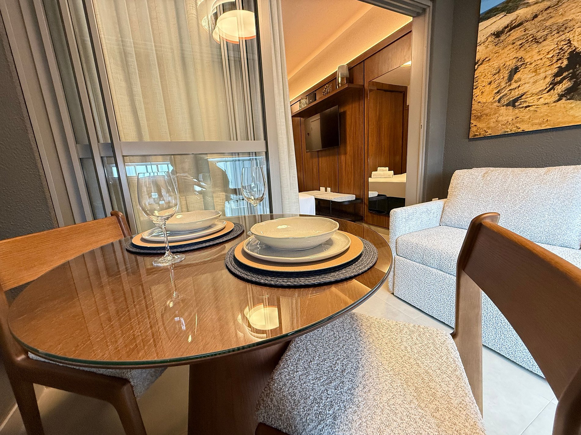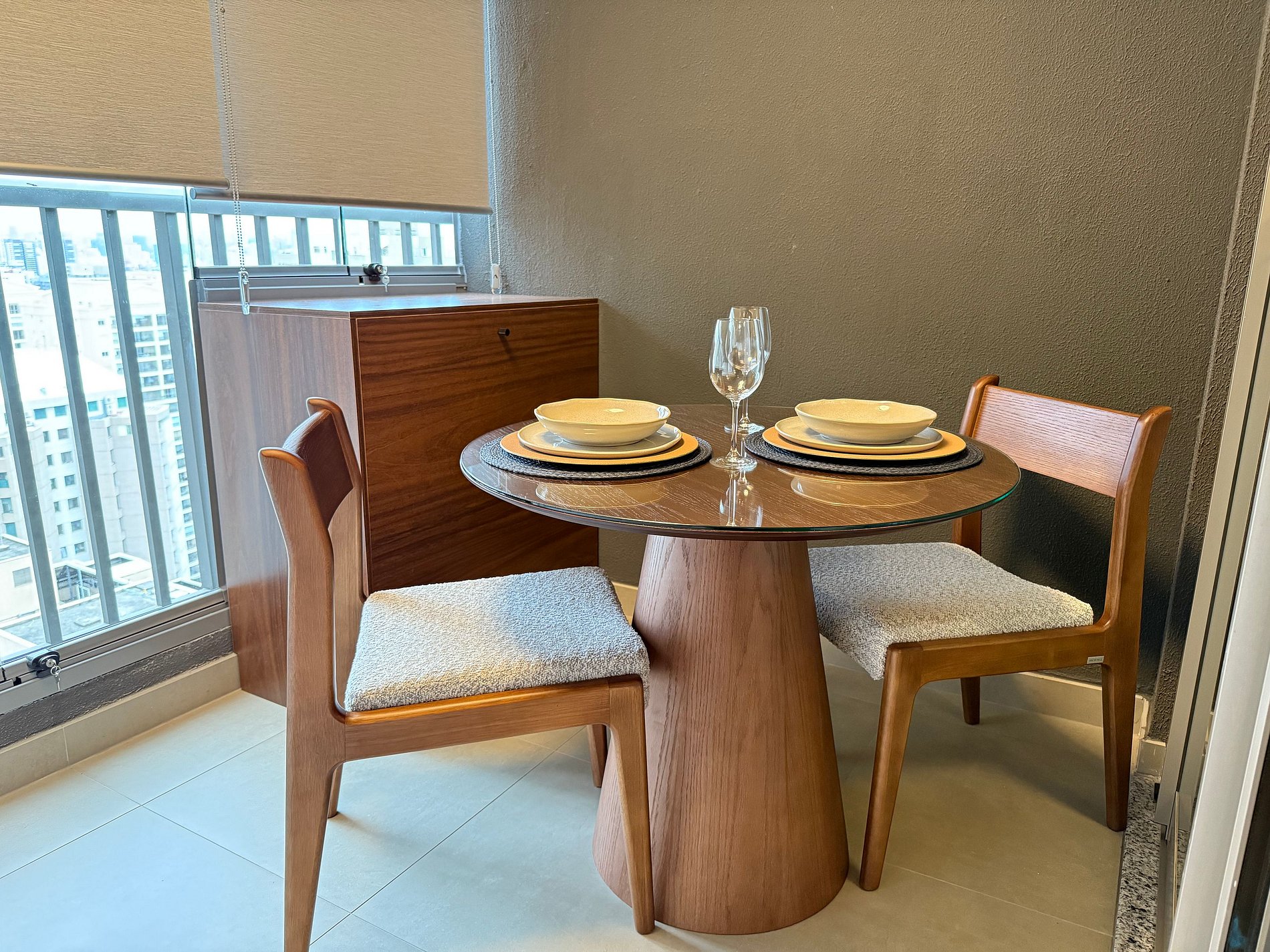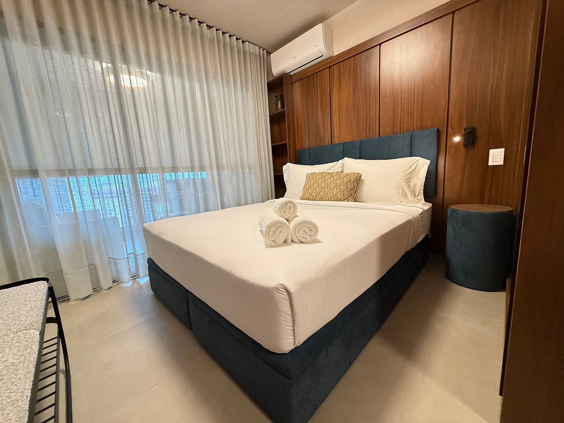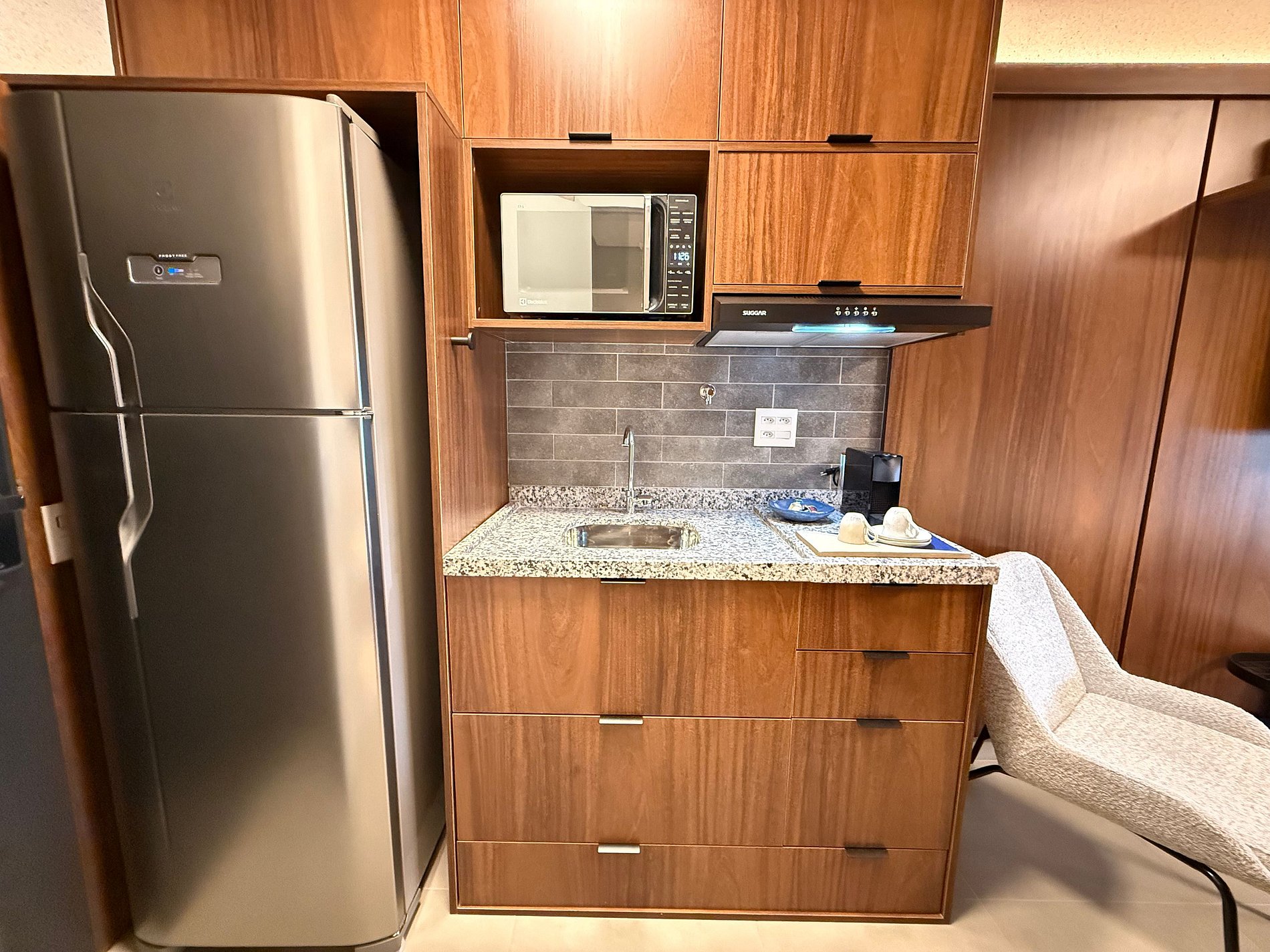 El estudio dispone de una cama queen con ropa de cama premium de hotel, aire acondicionado, Wi-Fi y una cocina compacta totalmente equipada con refrigerador, microondas, cafetera, hervidor eléctrico y sandwichera. El amplio balcón, con mesa de comedor y sofá, es un gran diferencial que amplía el espacio y permite relajarse o disfrutar comidas con vista urbana.