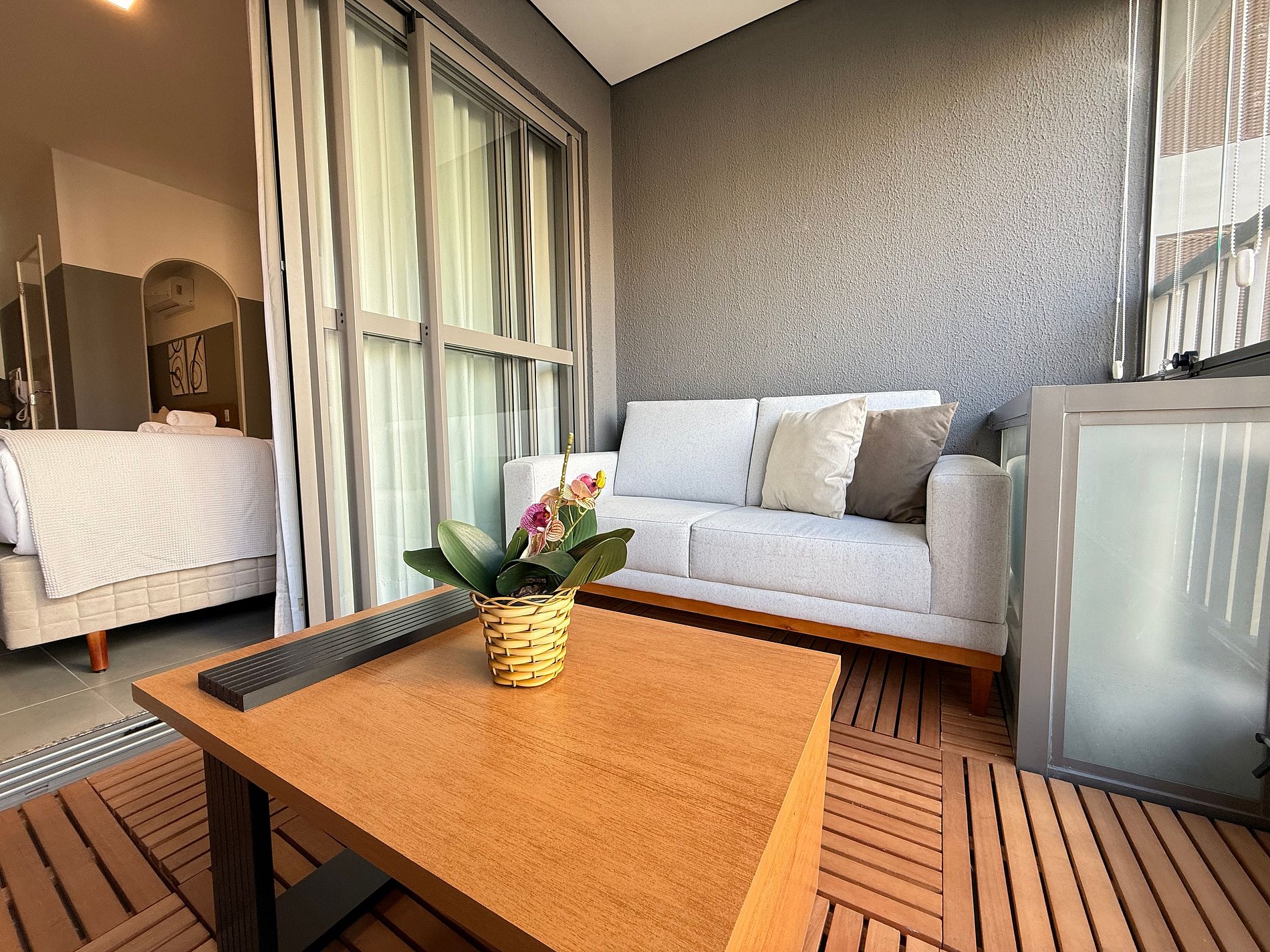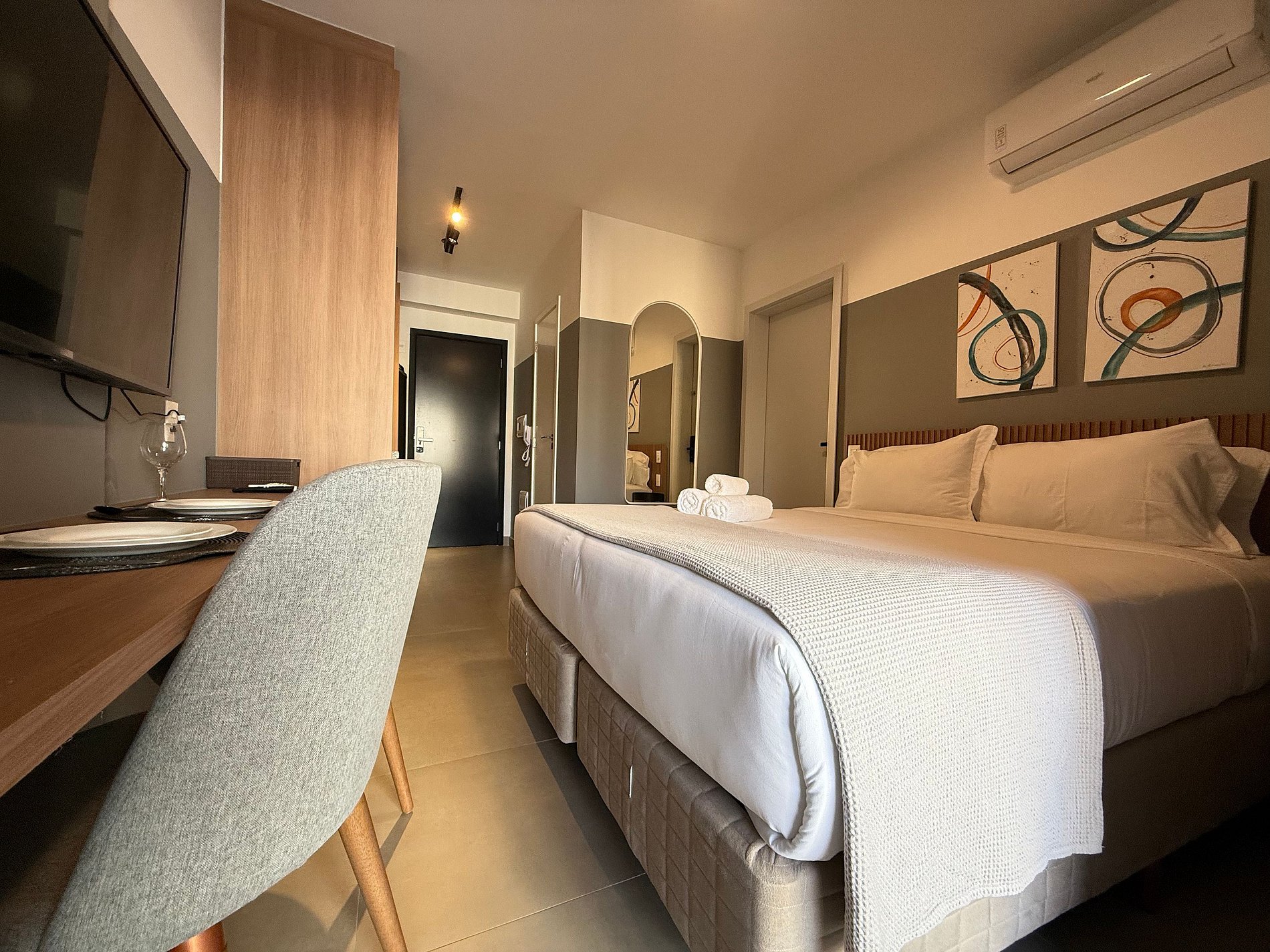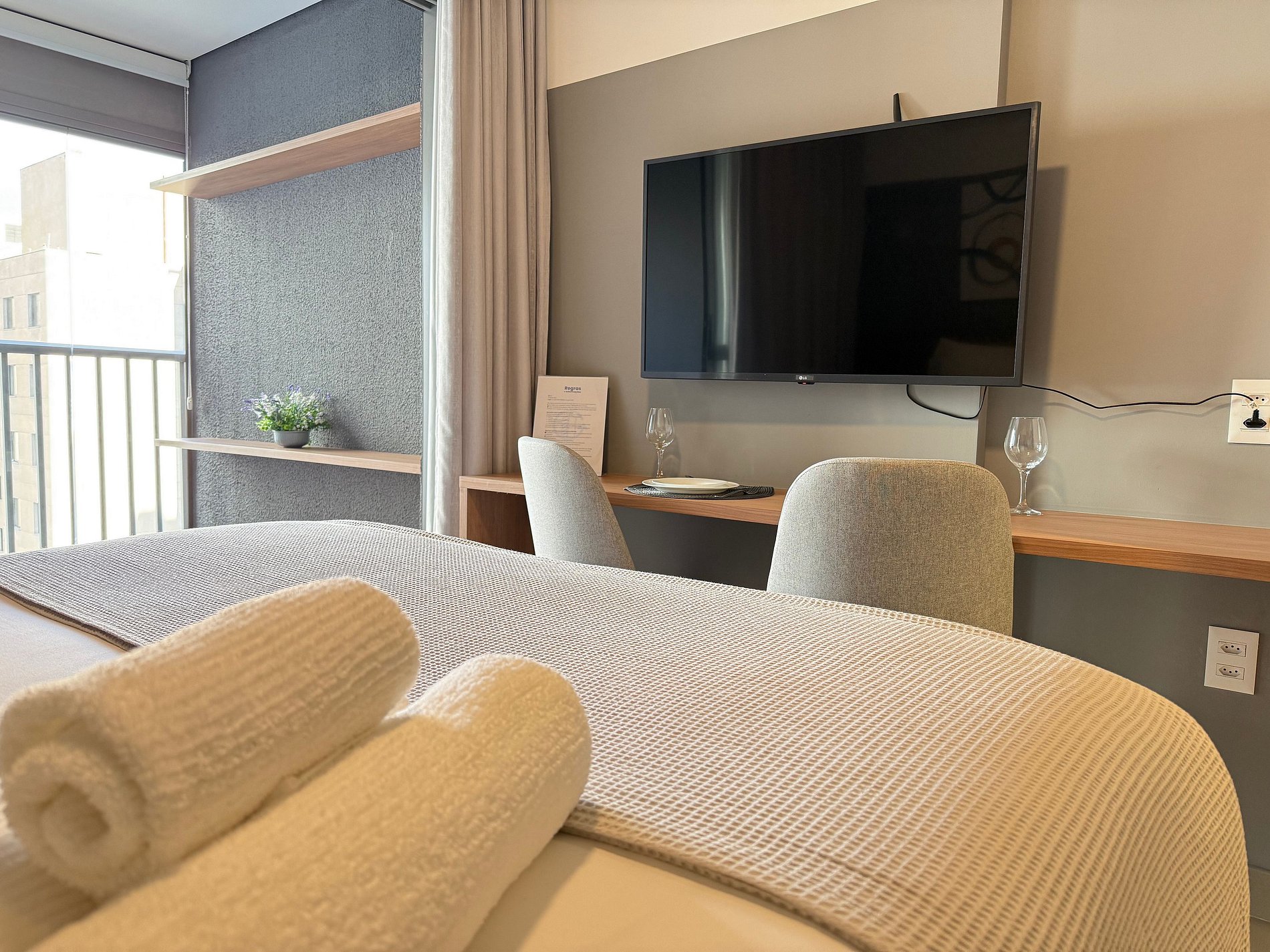 El estudio dispone de una cama queen con ropa de cama premium de hotel, aire acondicionado, Wi-Fi y una cocina compacta totalmente equipada con refrigerador, microondas, cafetera, hervidor eléctrico y sandwichera. El amplio balcón, con mesa de comedor y sofá, es un gran diferencial que amplía el espacio y permite relajarse o disfrutar comidas con vista urbana.