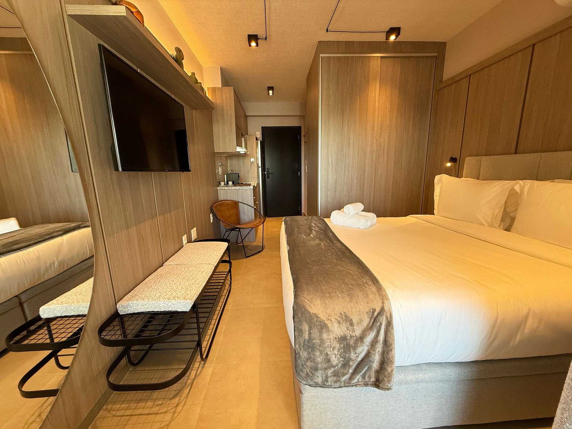 El estudio dispone de una cama queen con ropa de cama premium de hotel, aire acondicionado, Wi-Fi y una cocina compacta totalmente equipada con refrigerador, microondas, cafetera, hervidor eléctrico y sandwichera. El amplio balcón, con mesa de comedor y sofá, es un gran diferencial que amplía el espacio y permite relajarse o disfrutar comidas con vista urbana.