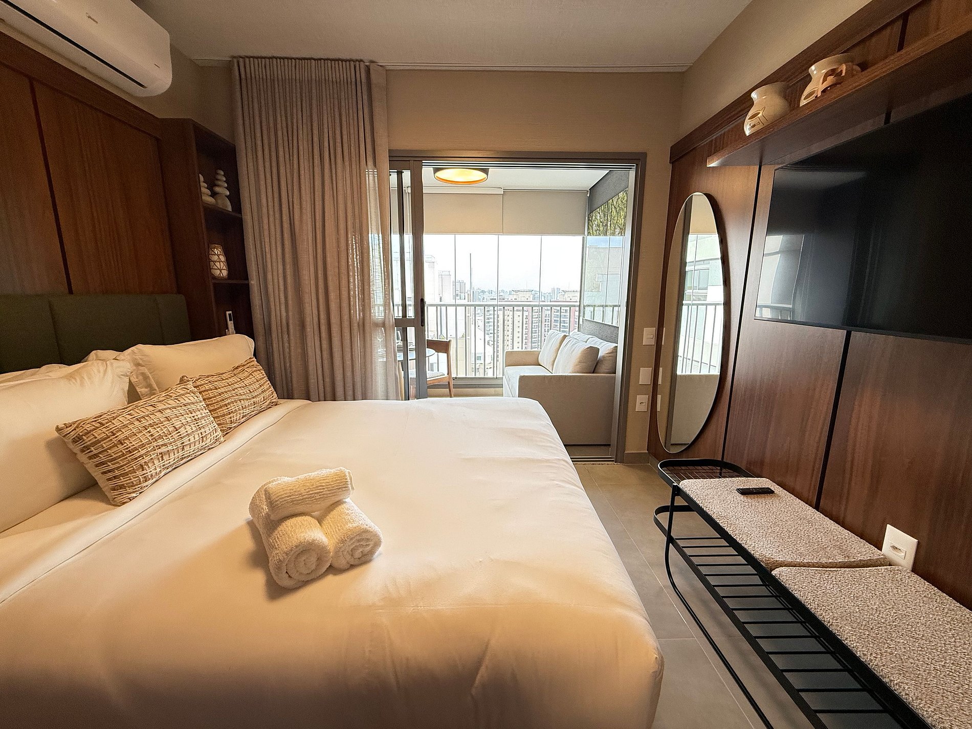 Os hóspedes encontrarão uma cama queen com enxoval de hotelaria premium, ar-condicionado, Wi-Fi de alta velocidade e uma cozinha compacta totalmente equipada com geladeira, micro-ondas, cafeteira, chaleira elétrica e sanduicheira. A varanda ampla, com mesa de jantar e sofá, funciona como uma extensão aconchegante do studio, perfeita para momentos de descanso ou refeições com vista para a cidade.