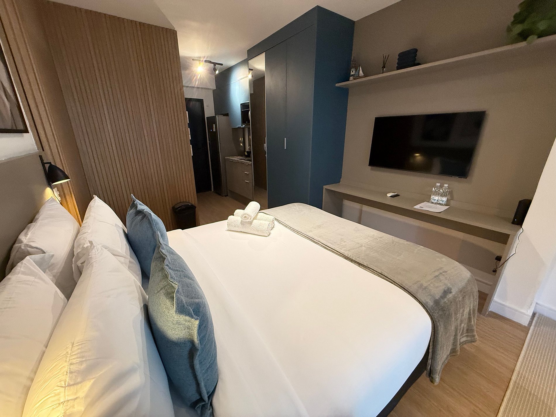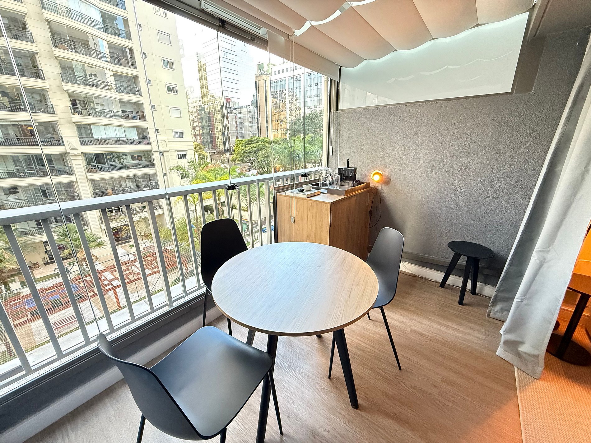 El estudio dispone de una cama queen con ropa de cama premium de hotel, aire acondicionado, Wi-Fi y una cocina compacta totalmente equipada con refrigerador, microondas, cafetera, hervidor eléctrico y sandwichera. El amplio balcón, con mesa de comedor y sofá, es un gran diferencial que amplía el espacio y permite relajarse o disfrutar comidas con vista urbana.