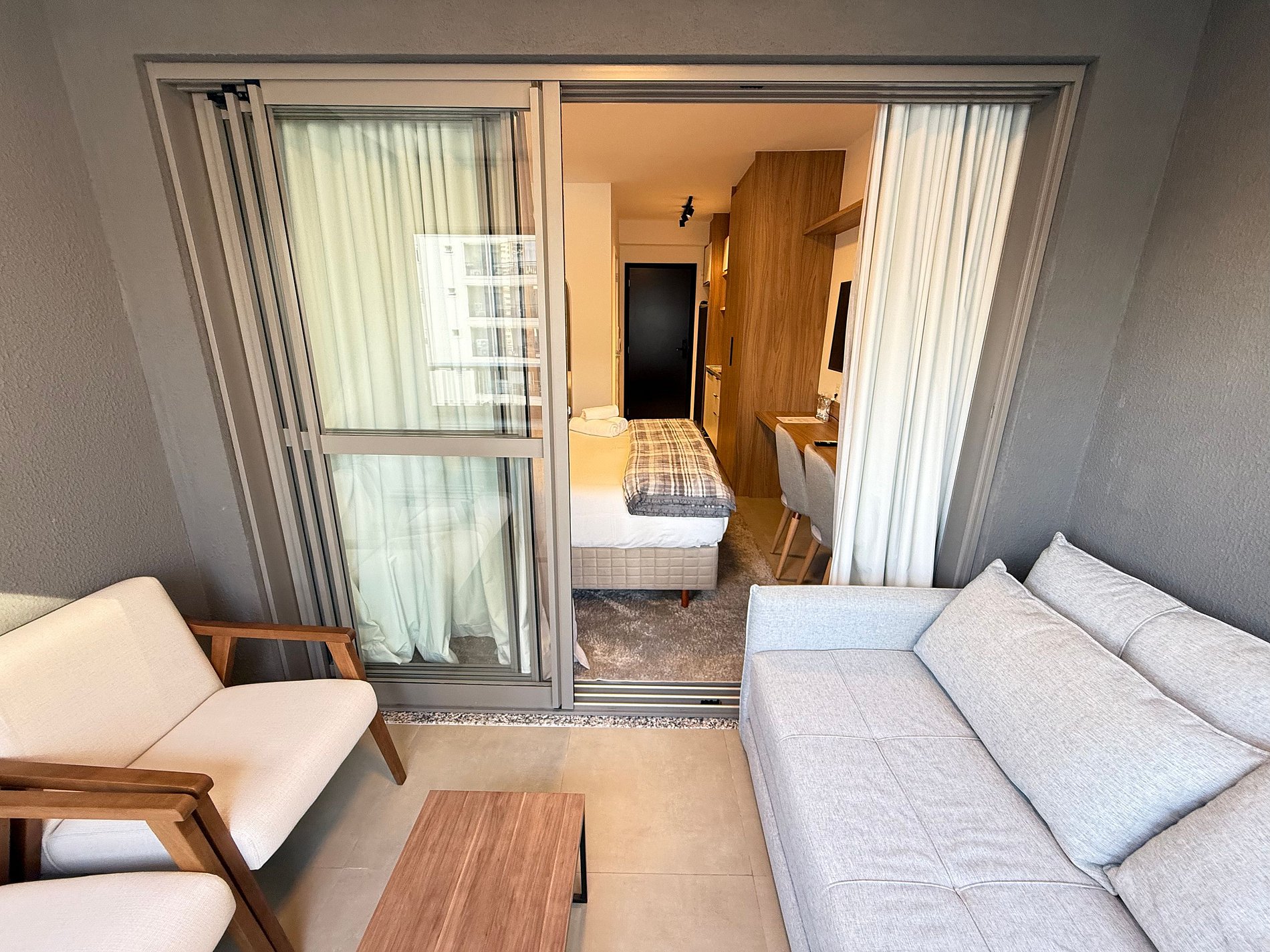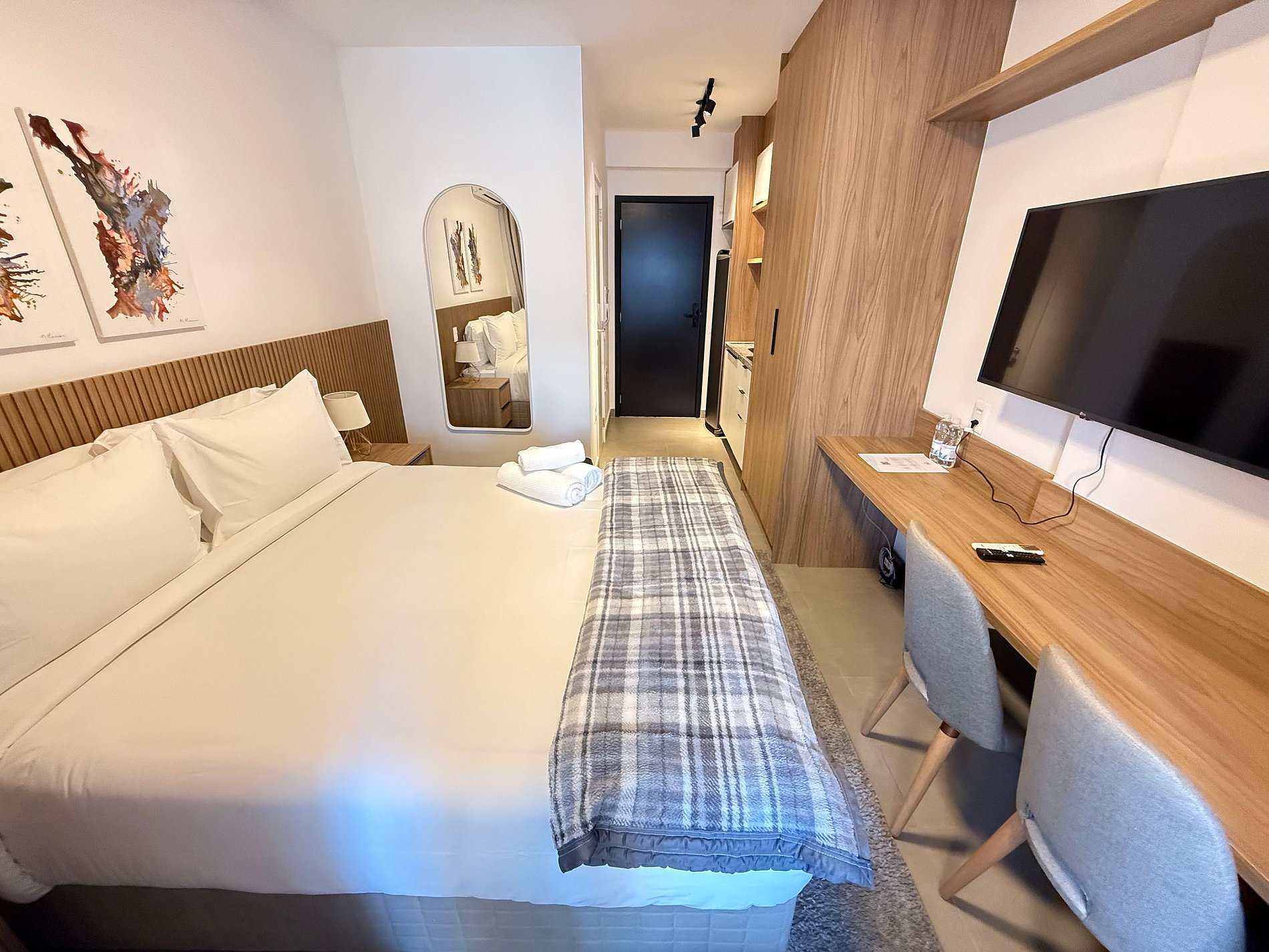 Os hóspedes encontrarão uma cama queen com enxoval de hotelaria premium, ar-condicionado, Wi-Fi de alta velocidade e uma cozinha compacta totalmente equipada com geladeira, micro-ondas, cafeteira, chaleira elétrica e sanduicheira. A varanda ampla, com mesa de jantar e sofá, funciona como uma extensão aconchegante do studio, perfeita para momentos de descanso ou refeições com vista para a cidade.