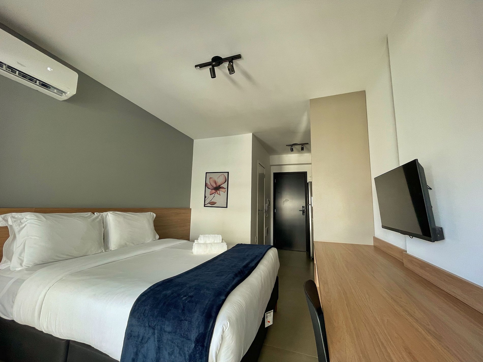 El estudio dispone de una cama queen con ropa de cama premium de hotel, aire acondicionado, Wi-Fi y una cocina compacta totalmente equipada con refrigerador, microondas, cafetera, hervidor eléctrico y sandwichera. El amplio balcón, con mesa de comedor y sofá, es un gran diferencial que amplía el espacio y permite relajarse o disfrutar comidas con vista urbana.