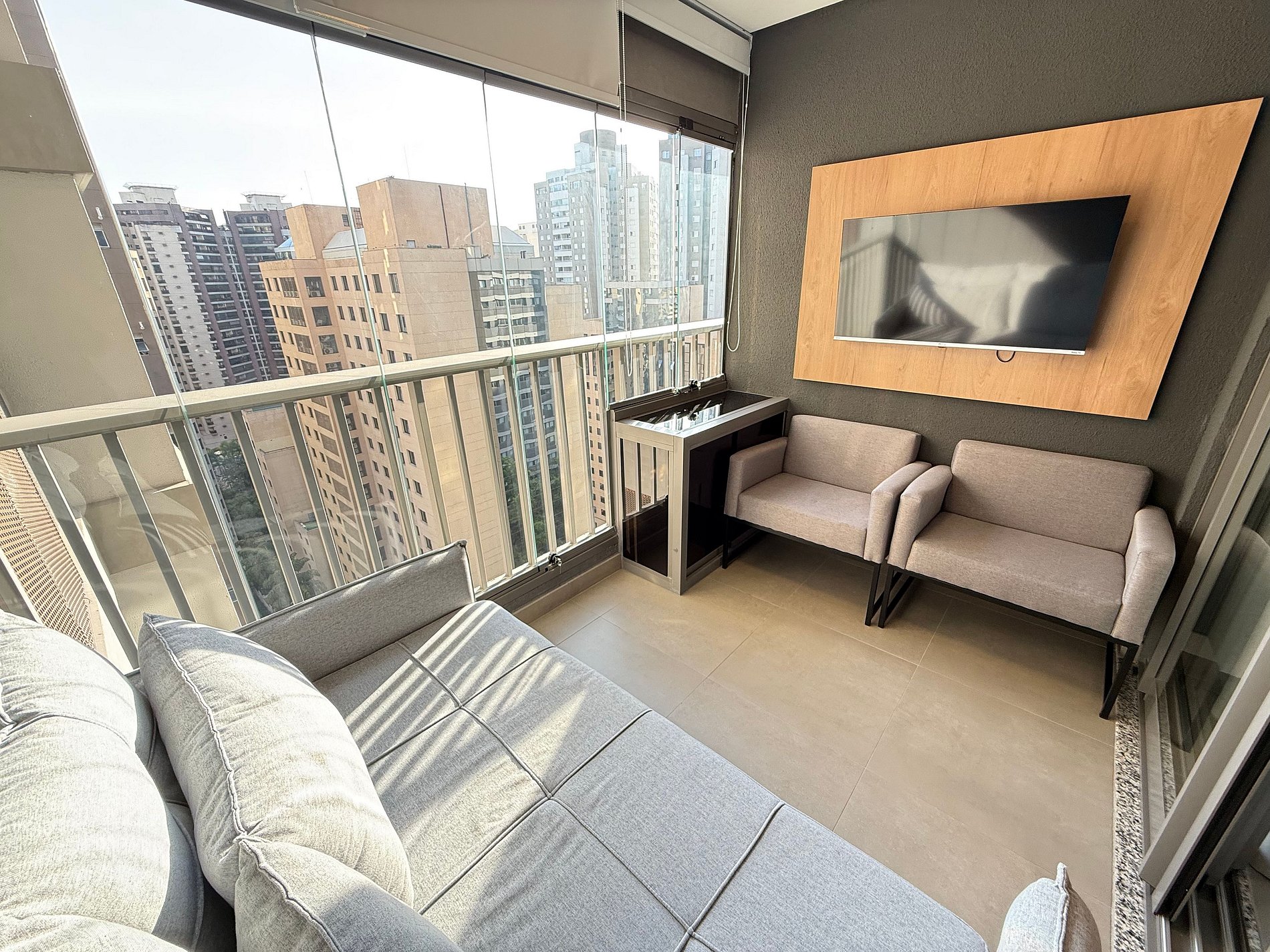 El estudio dispone de una cama queen con ropa de cama premium de hotel, aire acondicionado, Wi-Fi y una cocina compacta totalmente equipada con refrigerador, microondas, cafetera, hervidor eléctrico y sandwichera. El amplio balcón, con mesa de comedor y sofá, es un gran diferencial que amplía el espacio y permite relajarse o disfrutar comidas con vista urbana.