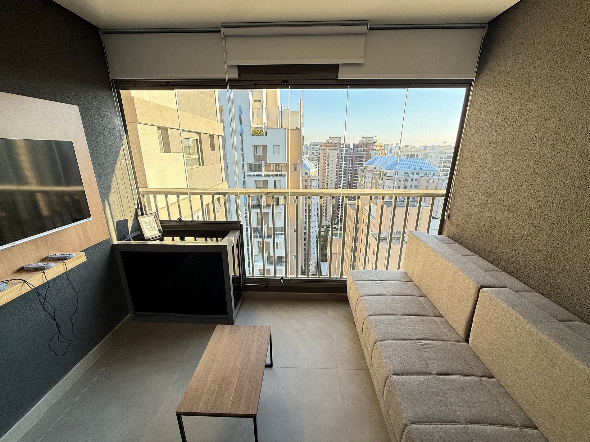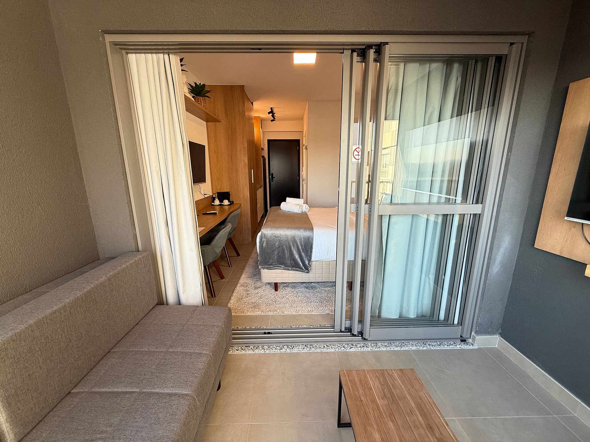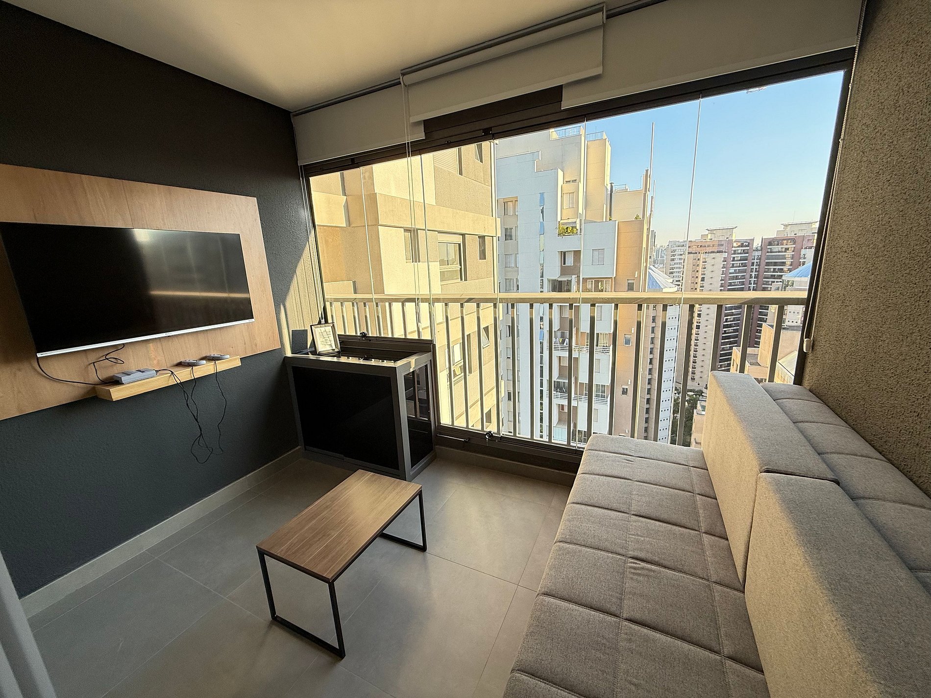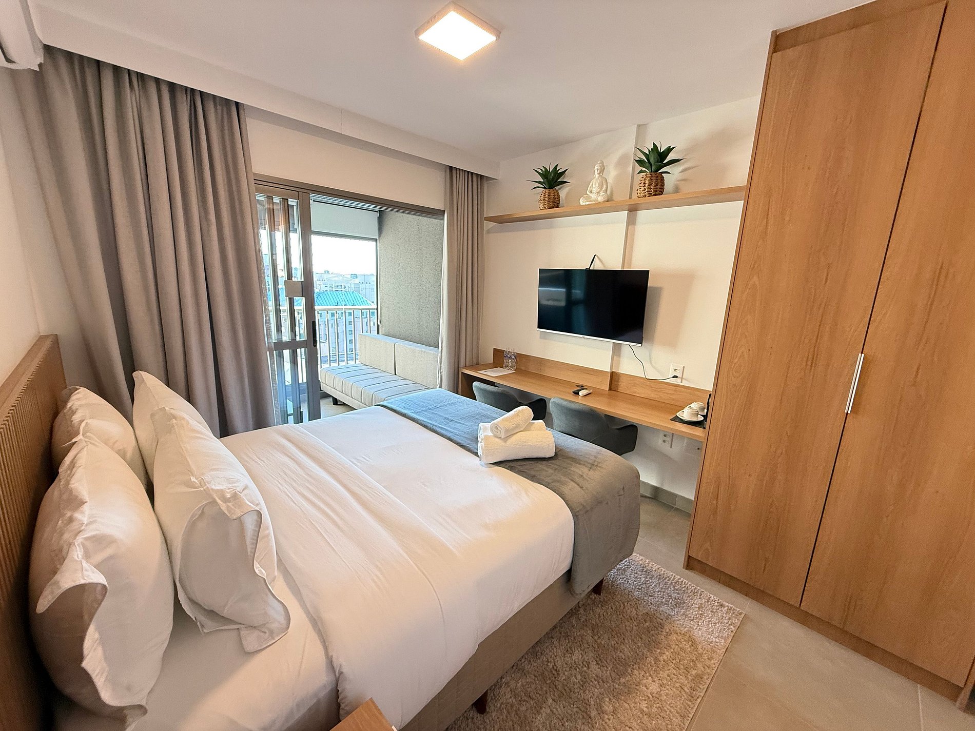 El estudio dispone de una cama queen con ropa de cama premium de hotel, aire acondicionado, Wi-Fi y una cocina compacta totalmente equipada con refrigerador, microondas, cafetera, hervidor eléctrico y sandwichera. El amplio balcón, con mesa de comedor y sofá, es un gran diferencial que amplía el espacio y permite relajarse o disfrutar comidas con vista urbana.