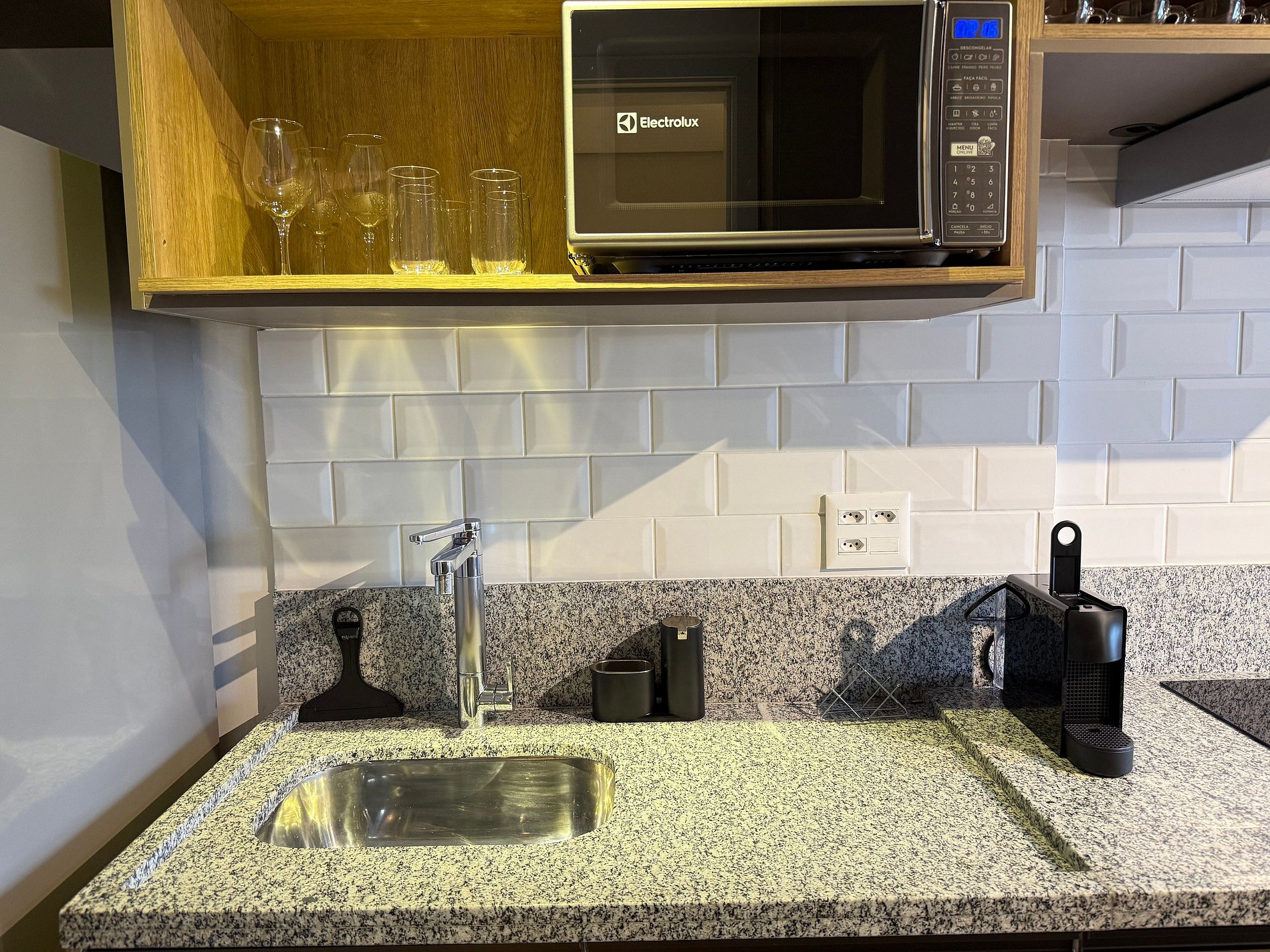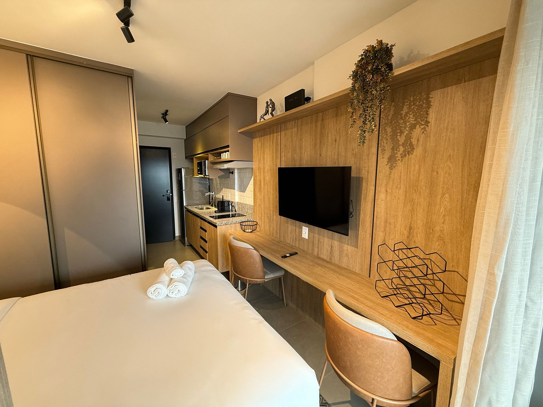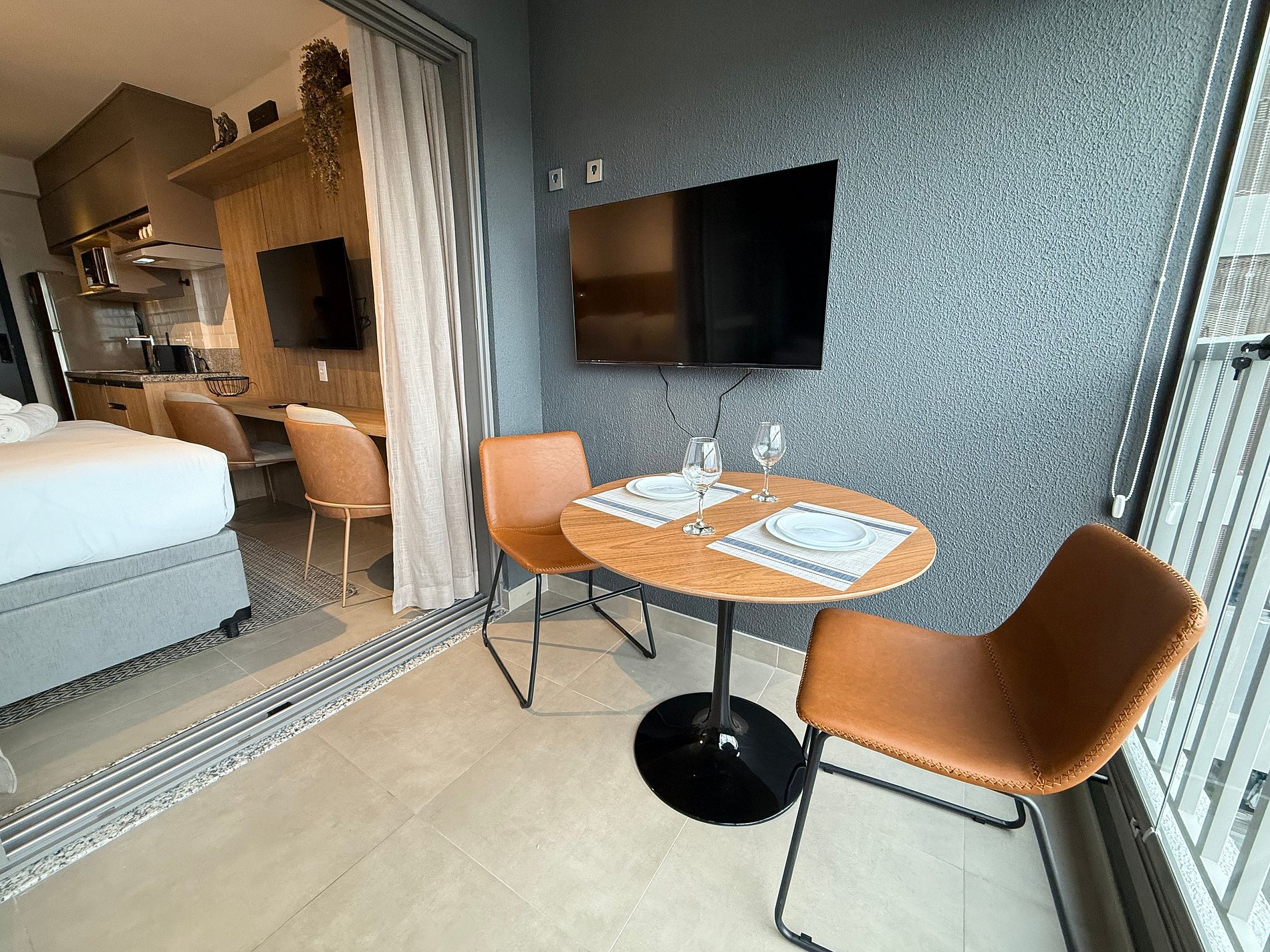 El estudio dispone de una cama queen con ropa de cama premium de hotel, aire acondicionado, Wi-Fi y una cocina compacta totalmente equipada con refrigerador, microondas, cafetera, hervidor eléctrico y sandwichera. El amplio balcón, con mesa de comedor y sofá, es un gran diferencial que amplía el espacio y permite relajarse o disfrutar comidas con vista urbana.