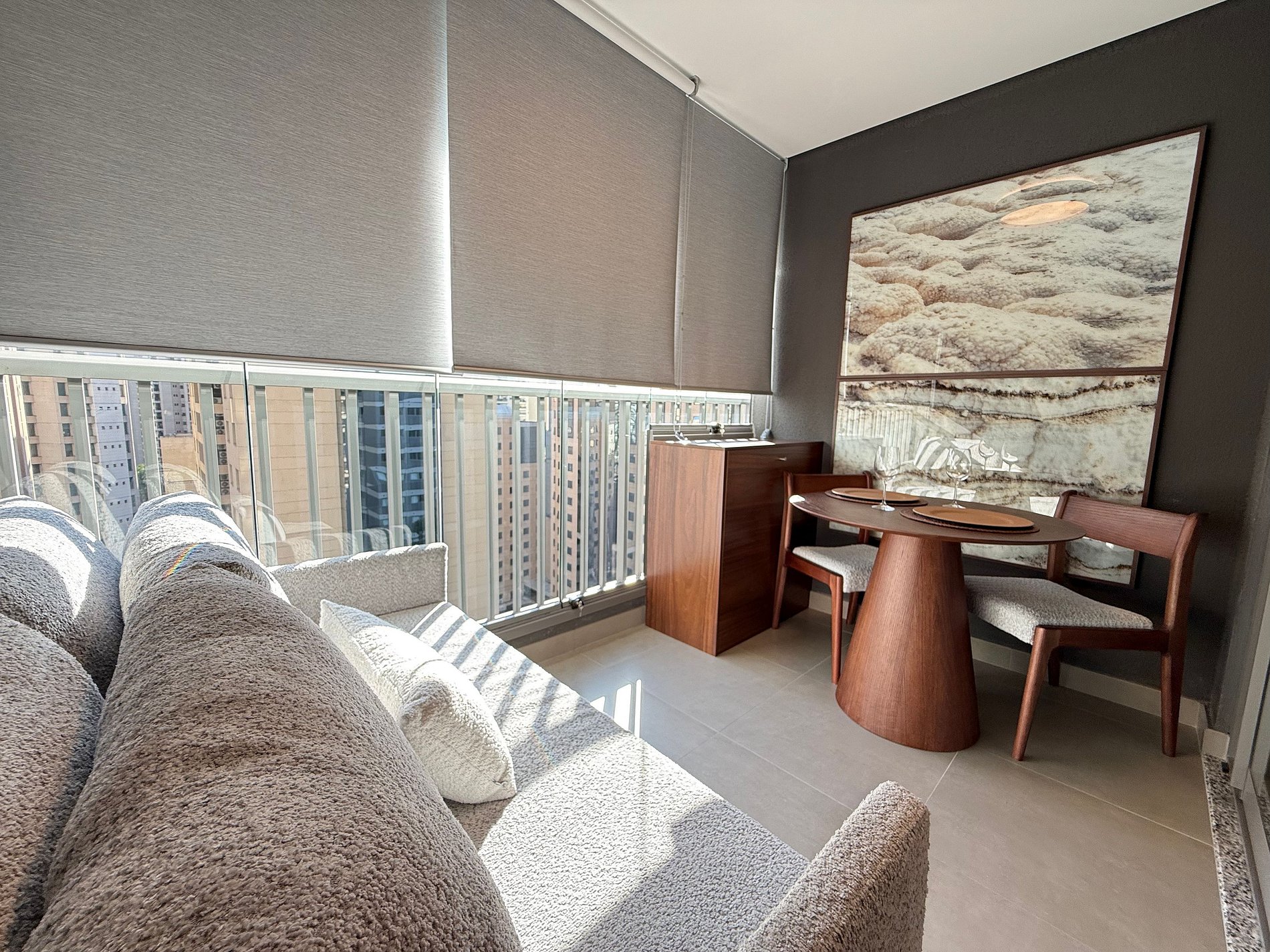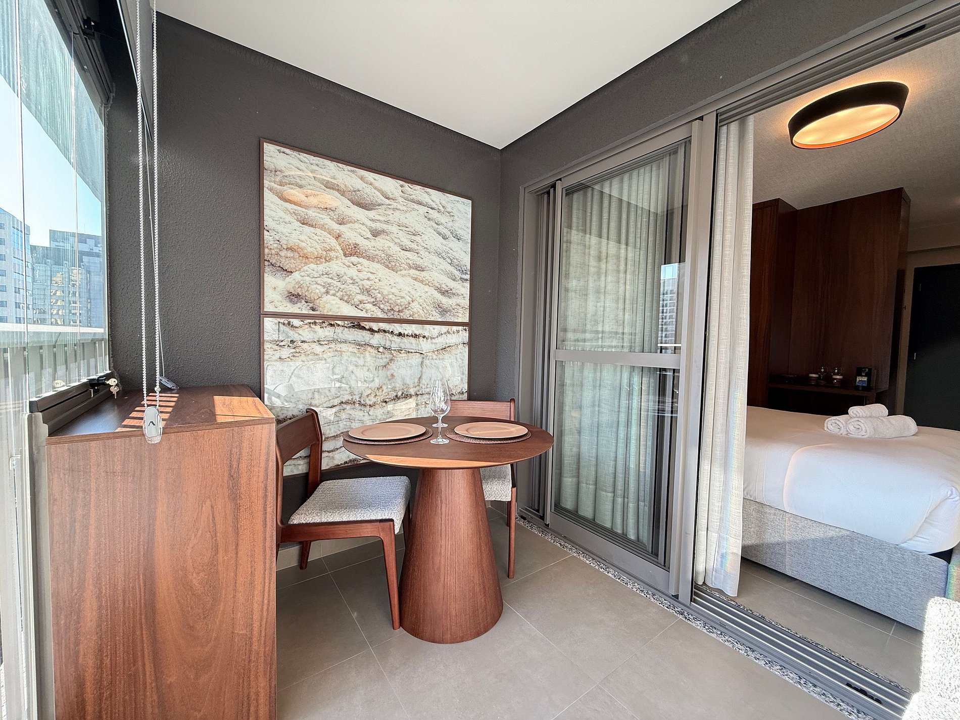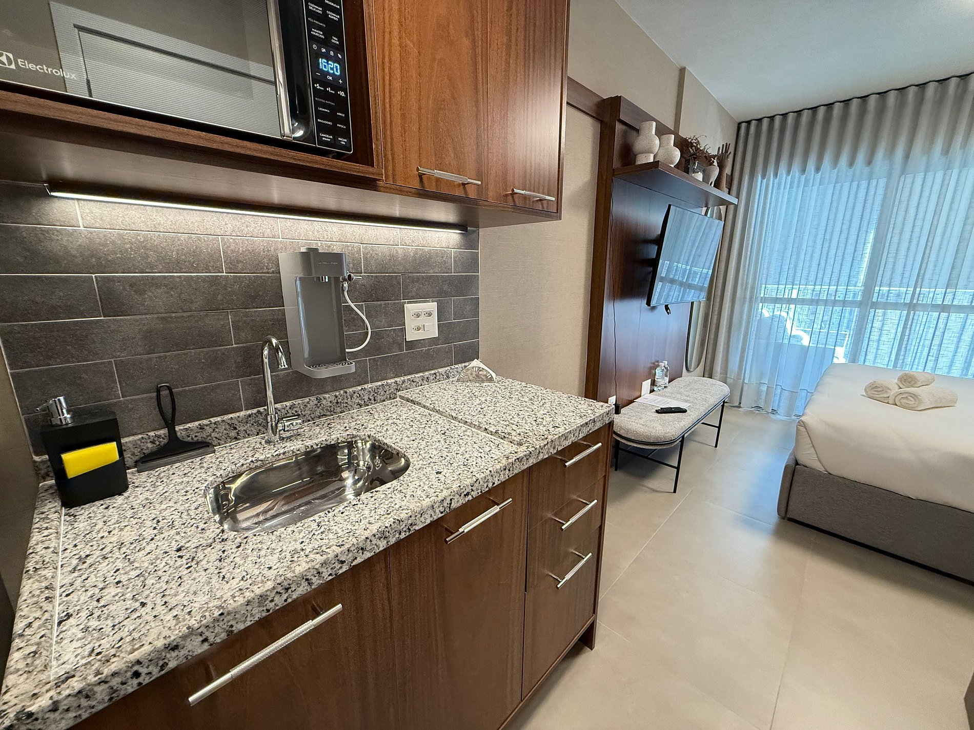 El estudio dispone de una cama queen con ropa de cama premium de hotel, aire acondicionado, Wi-Fi y una cocina compacta totalmente equipada con refrigerador, microondas, cafetera, hervidor eléctrico y sandwichera. El amplio balcón, con mesa de comedor y sofá, es un gran diferencial que amplía el espacio y permite relajarse o disfrutar comidas con vista urbana.