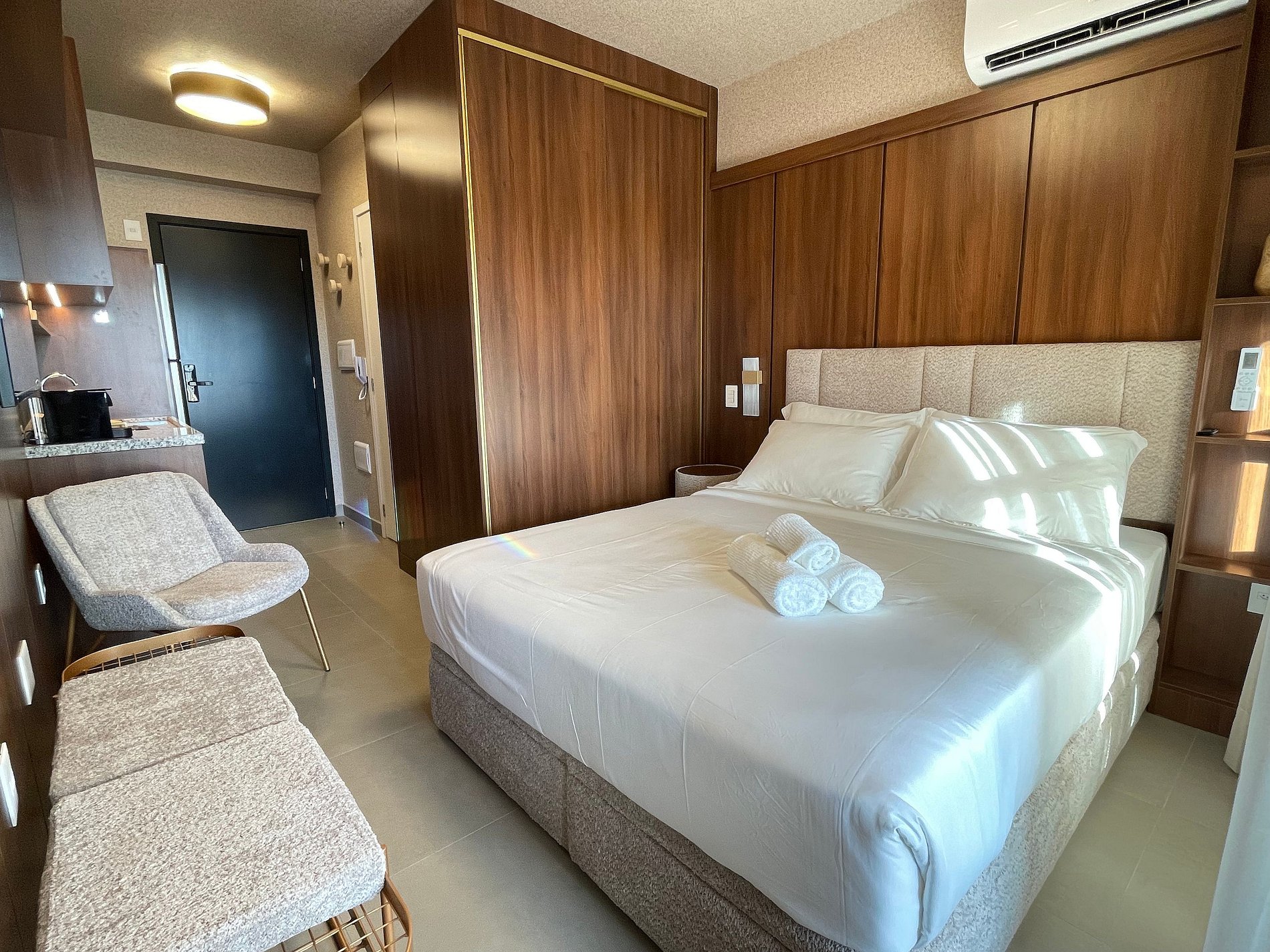 El estudio dispone de una cama queen con ropa de cama premium de hotel, aire acondicionado, Wi-Fi y una cocina compacta totalmente equipada con refrigerador, microondas, cafetera, hervidor eléctrico y sandwichera. El amplio balcón, con mesa de comedor y sofá, es un gran diferencial que amplía el espacio y permite relajarse o disfrutar comidas con vista urbana.