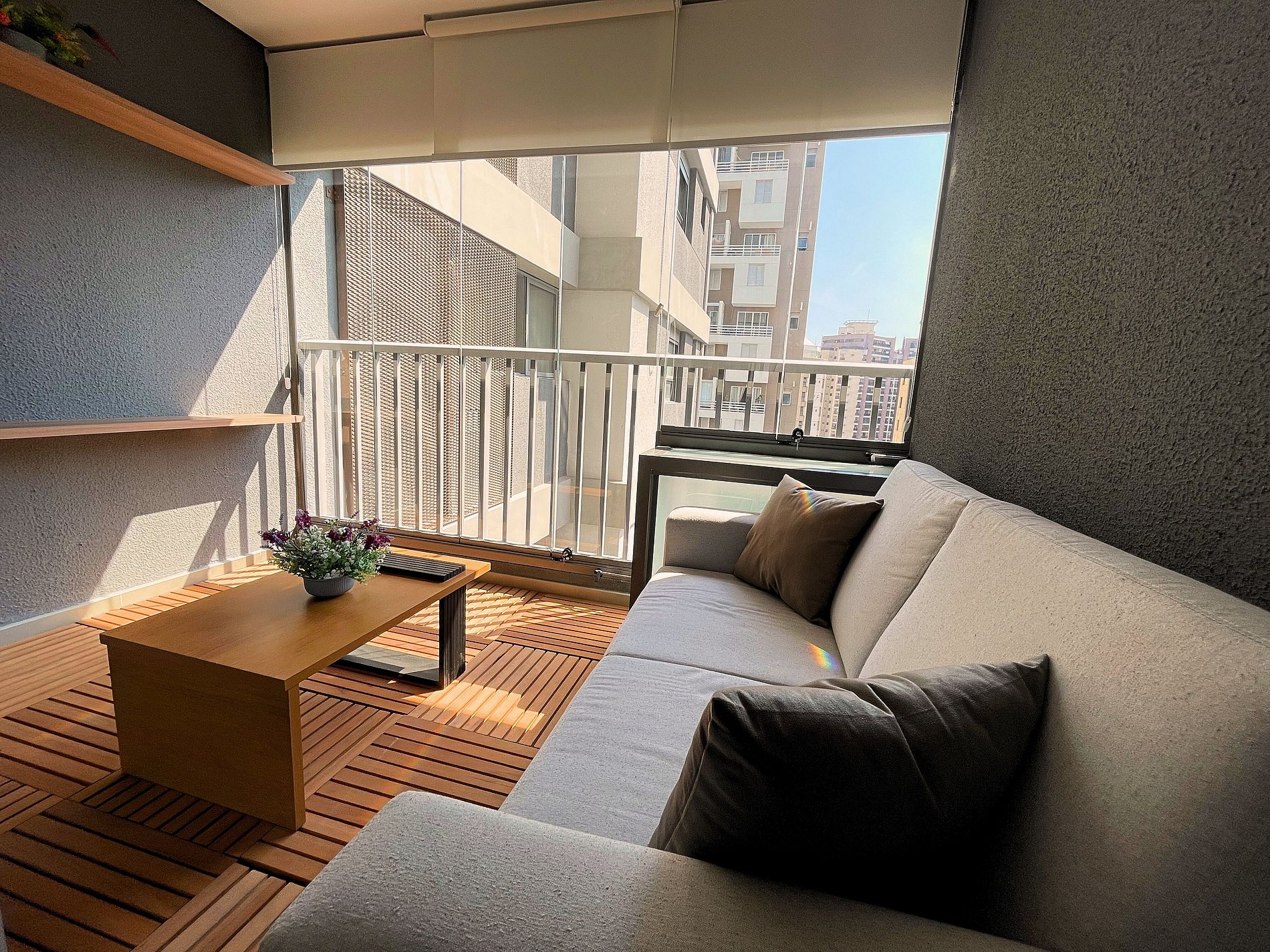 El estudio dispone de una cama queen con ropa de cama premium de hotel, aire acondicionado, Wi-Fi y una cocina compacta totalmente equipada con refrigerador, microondas, cafetera, hervidor eléctrico y sandwichera. El amplio balcón, con mesa de comedor y sofá, es un gran diferencial que amplía el espacio y permite relajarse o disfrutar comidas con vista urbana.