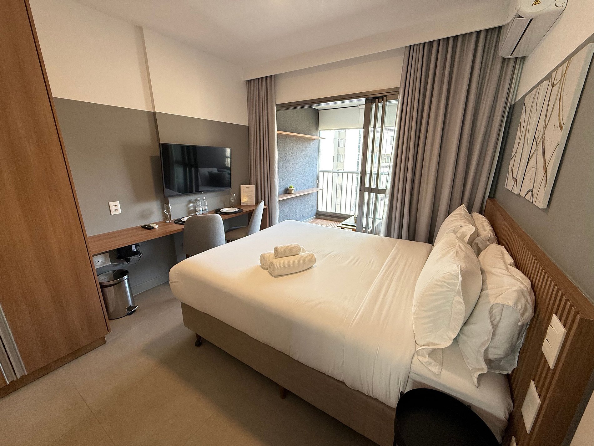 O studio conta com cama queen size e enxoval de hotelaria premium, ar-condicionado, Wi-Fi e uma cozinha compacta totalmente equipada com geladeira, micro-ondas, cafeteira, chaleira elétrica e sanduicheira. A varanda ampla, com mesa de jantar e sofá, é um diferencial que amplia o espaço e proporciona momentos agradáveis, seja para relaxar ou fazer refeições com vista urbana.