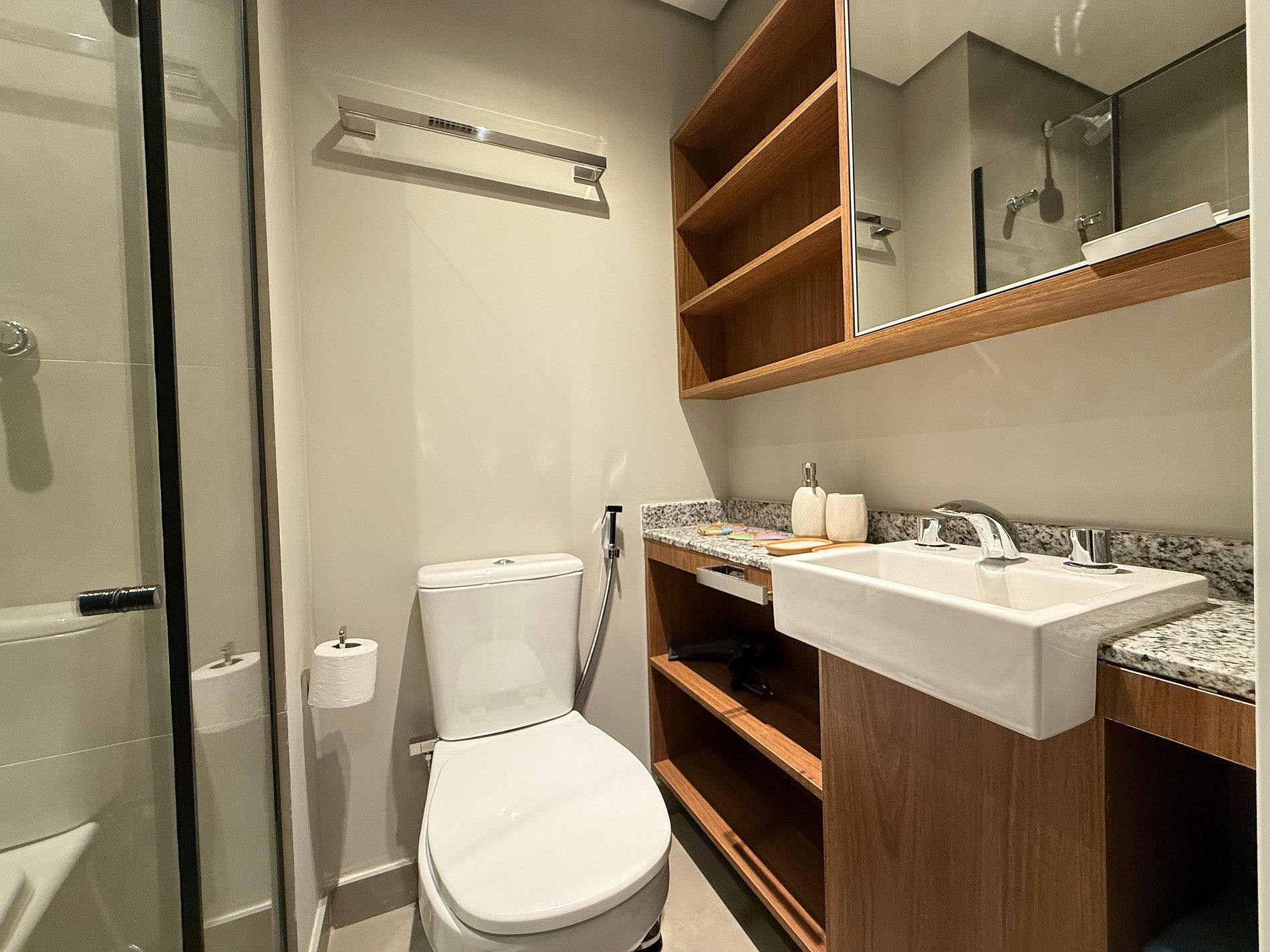 O studio conta com cama queen size e enxoval de hotelaria premium, ar-condicionado, Wi-Fi e uma cozinha compacta totalmente equipada com geladeira, micro-ondas, cafeteira, chaleira elétrica e sanduicheira. A varanda ampla, com mesa de jantar e sofá, é um diferencial que amplia o espaço e proporciona momentos agradáveis, seja para relaxar ou fazer refeições com vista urbana.