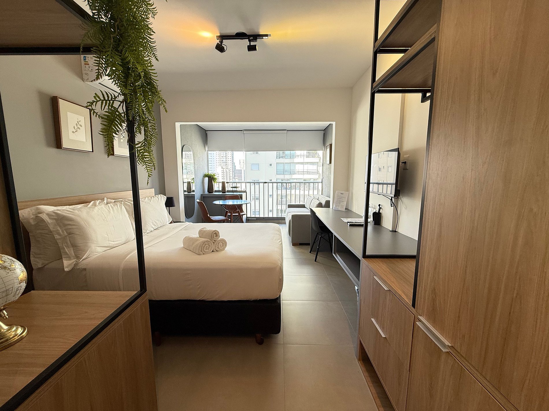 O studio conta com cama queen size e enxoval de hotelaria premium, ar-condicionado, Wi-Fi e uma cozinha compacta totalmente equipada com geladeira, micro-ondas, cafeteira, chaleira elétrica e sanduicheira. A varanda ampla, com mesa de jantar e sofá, é um diferencial que amplia o espaço e proporciona momentos agradáveis, seja para relaxar ou fazer refeições com vista urbana.