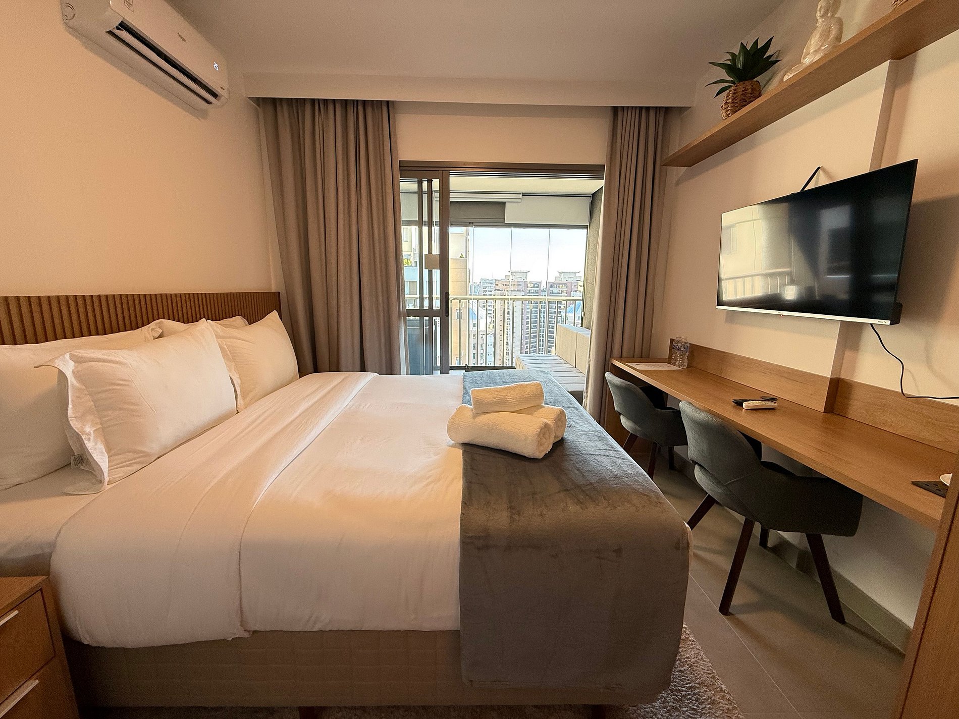 O studio conta com cama queen size e enxoval de hotelaria premium, ar-condicionado, Wi-Fi e uma cozinha compacta totalmente equipada com geladeira, micro-ondas, cafeteira, chaleira elétrica e sanduicheira. A varanda ampla, com mesa de jantar e sofá, é um diferencial que amplia o espaço e proporciona momentos agradáveis, seja para relaxar ou fazer refeições com vista urbana.