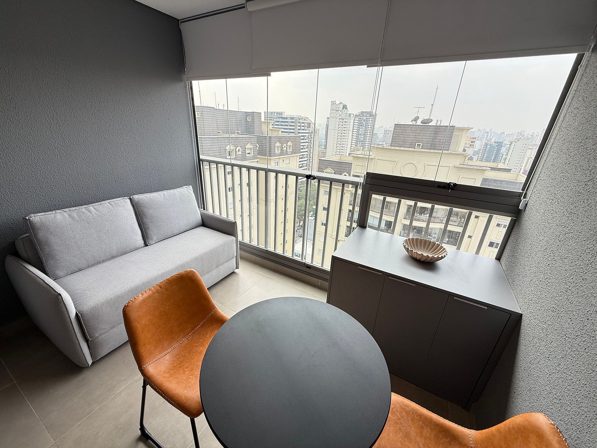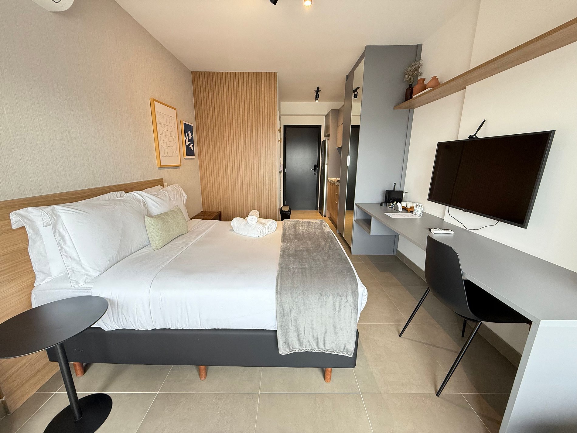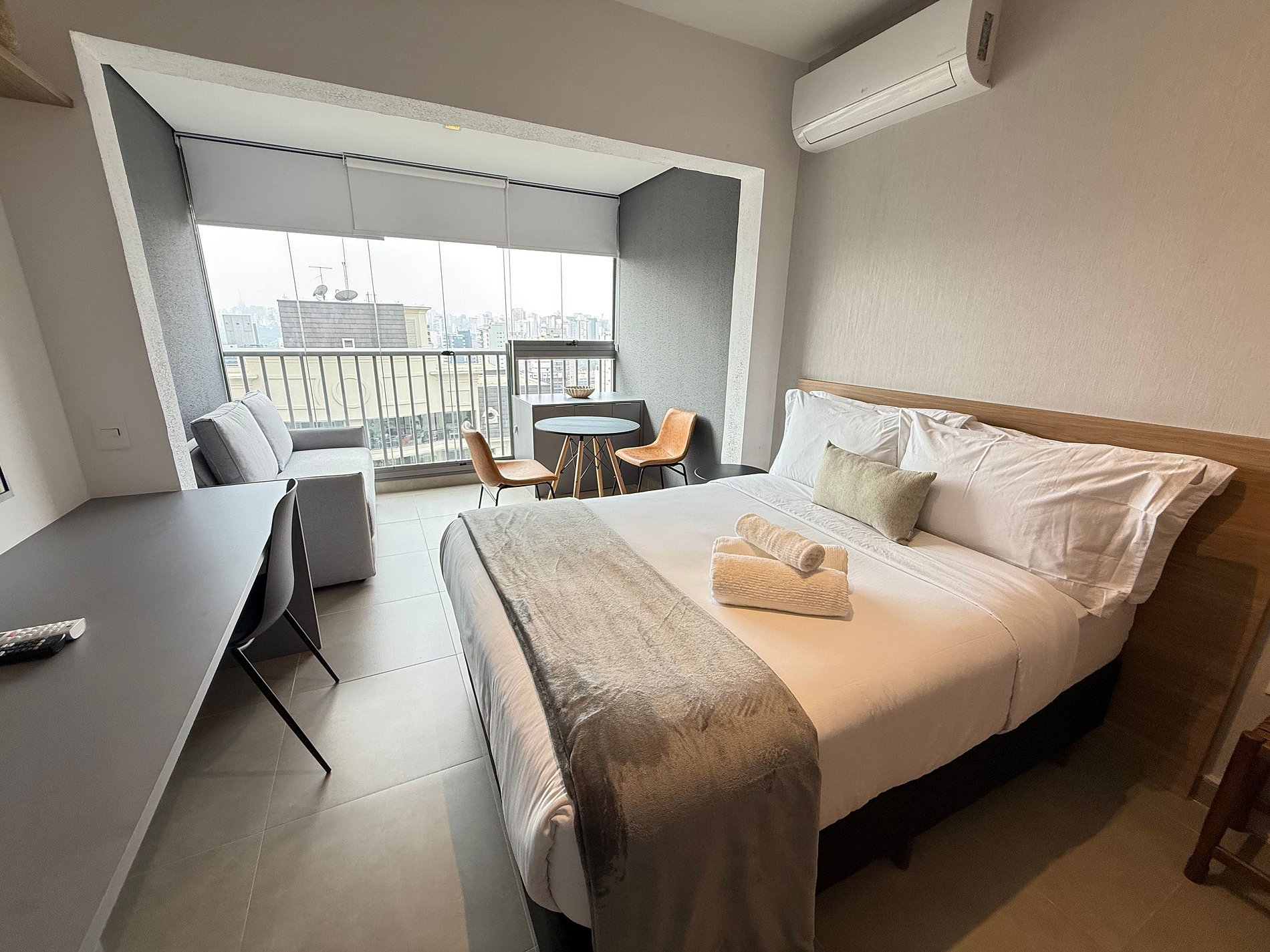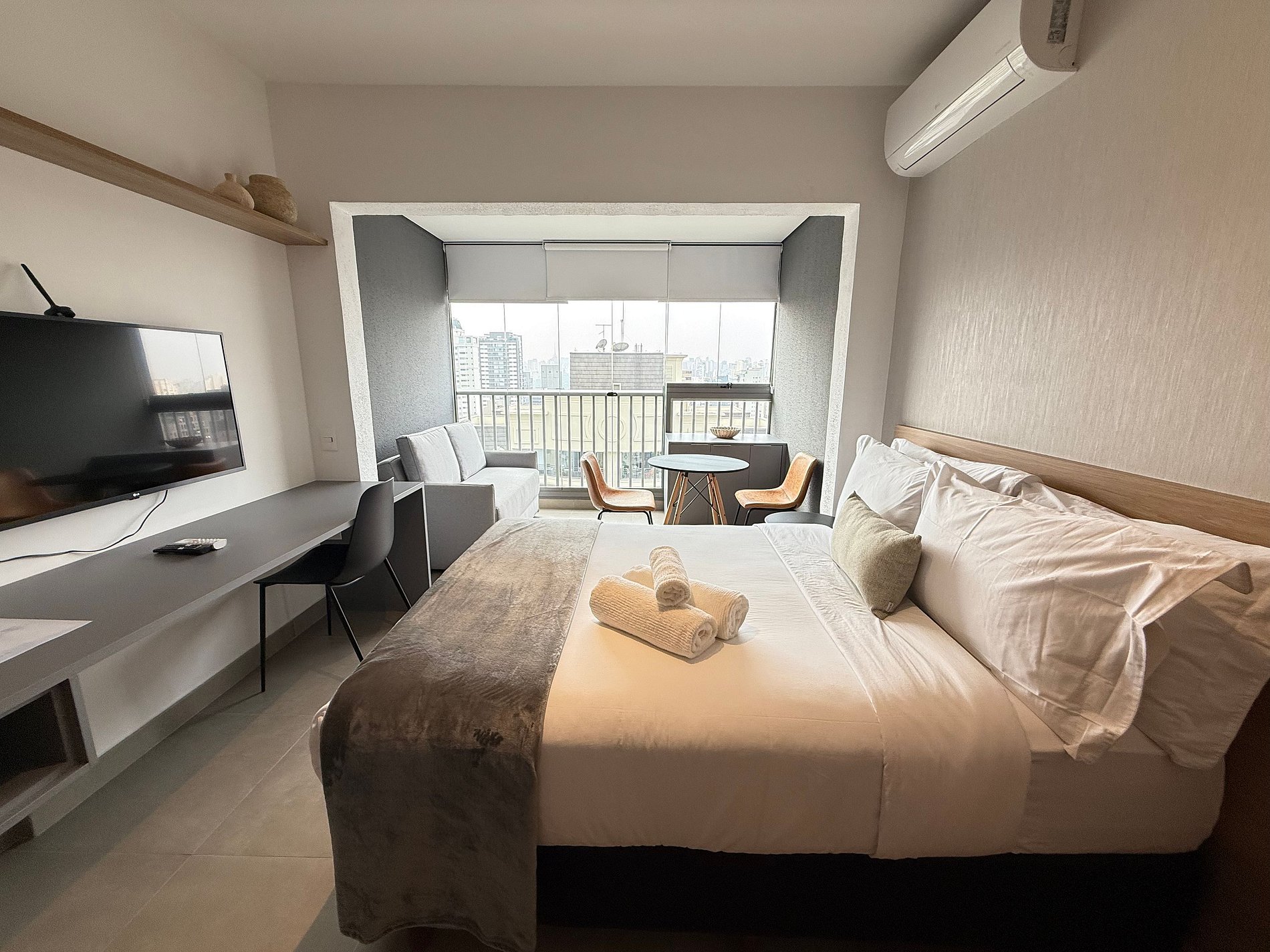 O studio conta com cama queen size e enxoval de hotelaria premium, ar-condicionado, Wi-Fi e uma cozinha compacta totalmente equipada com geladeira, micro-ondas, cafeteira, chaleira elétrica e sanduicheira. A varanda ampla, com mesa de jantar e sofá, é um diferencial que amplia o espaço e proporciona momentos agradáveis, seja para relaxar ou fazer refeições com vista urbana.