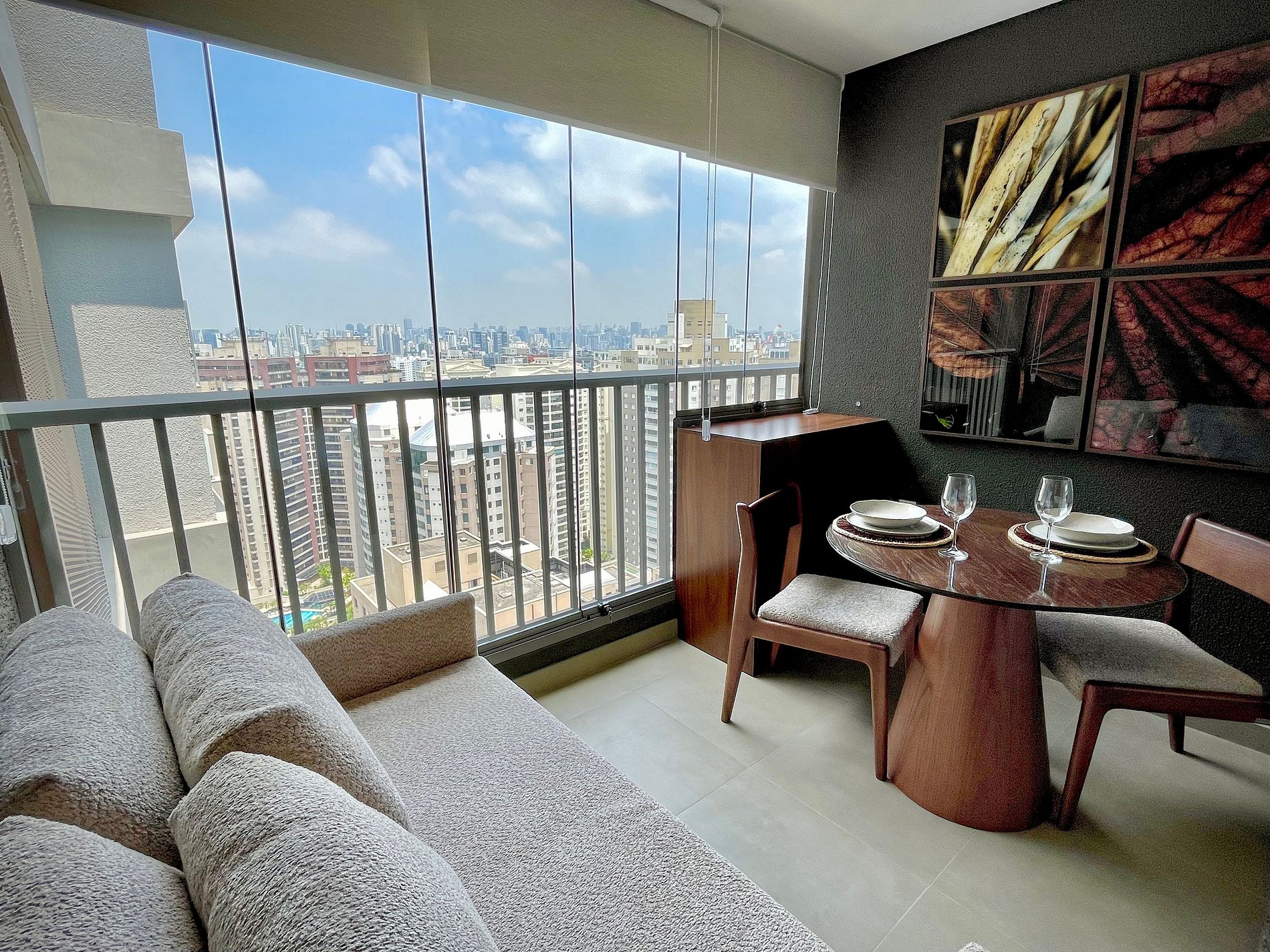 O studio conta com cama queen size e enxoval de hotelaria premium, ar-condicionado, Wi-Fi e uma cozinha compacta totalmente equipada com geladeira, micro-ondas, cafeteira, chaleira elétrica e sanduicheira. A varanda ampla, com mesa de jantar e sofá, é um diferencial que amplia o espaço e proporciona momentos agradáveis, seja para relaxar ou fazer refeições com vista urbana.